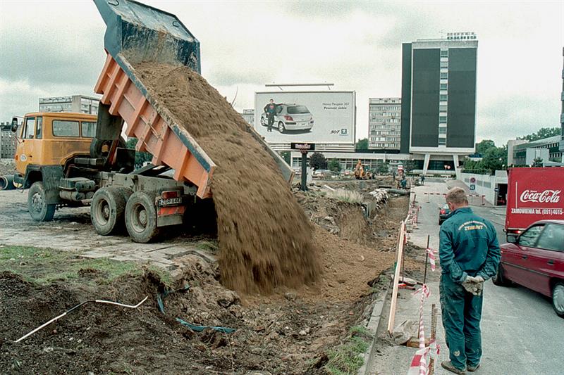 Budowa centrum handlowego przy al. Wyzwolenia w Szczecinie („Galaxy”) rozpoczęła się w II połowie 2001 r. Prace trwały dwa lata. 1 października 2003 r. inwestor udostępnił centrum klientom. Po zakończeniu tego etapu budowy powierzchnia centrum wraz z parkingami wynosiła blisko 100 000 metrów kwadratowych. Uruchomiono około 150 punktów sprzedażowych, parkingi mogły pomieścić 1300 samochodów. Na zdjęciu naszego fotoreportera widzimy w tle sylwetkę hotelu „Neptun”. Stał w tym miejscu do 2011 r. Po jego rozbiórce rozpoczęła się budowa drugiej części „Galaxy”, którą oddano do użytku w 2017 r.