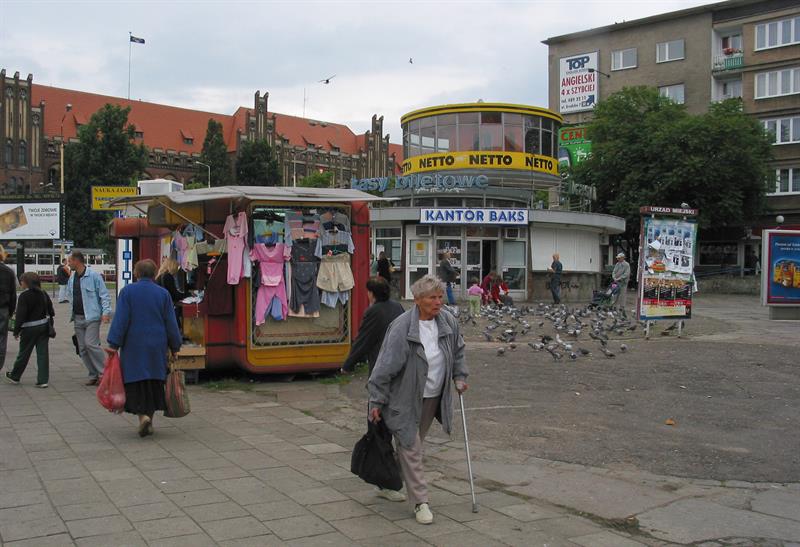Ten kawałek Szczecina obrazuje, jak wiele zmieniło się w centrum miasta. Nie ma już „grzybka”, w którego górnej części mieściła się komunikacyjna dyspozytornia. Na dole zaś była kasa biletowa i kantor walutowy. Przestrzeń wokół była rajem dla dziesiątek gołębi dokarmianych przez okolicznych mieszkańców. W „plastikowej” budce drobny handel, pozostałość po latach 90. ubiegłego wieku, gdy lawinowo rozwijała się polska przedsiębiorczość. Zdjęcie Dariusza Gorajskiego pochodzi z lipca 2002 roku. Potem „grzybek” lub – jak kto woli – „okrąglak” zburzono. Na placu przy Bramie Portowej hiszpański deweloper miał wybudować biurowiec o nieco futurystycznej sylwetce. Jednak zagrodzony blaszanym płotem, rozkopany teren nie doczekał się inwestycji. Ostatecznie szwedzka firma zbudowała tu biurowiec o metalicznej elewacji. A gołębie? Znalazły sobie inne miejsca w śródmieściu.