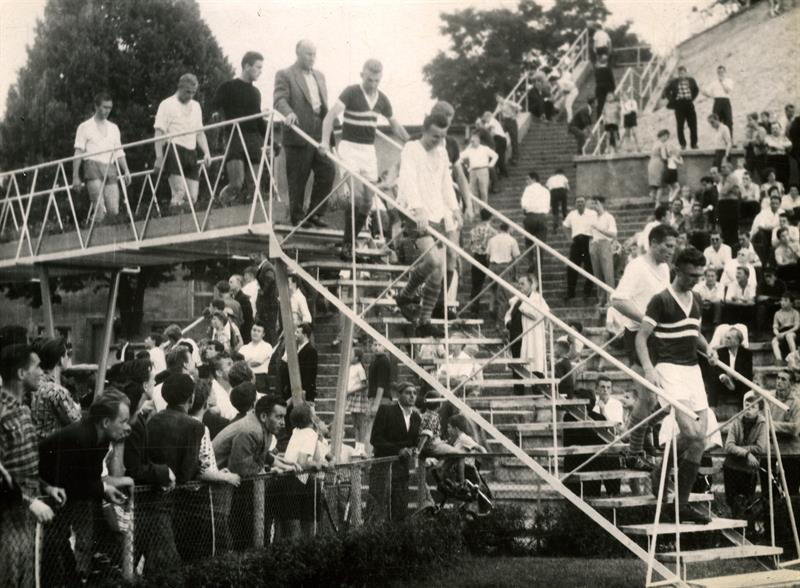 Zielony blaszak przejście na wysokościowe dla piłkarzy działaczy trenerów związanych z drużyną sedziów z lat 80 ubiegłego wieku XX wieku. Po schodkach do góry tunelowo i zejście w dół.
