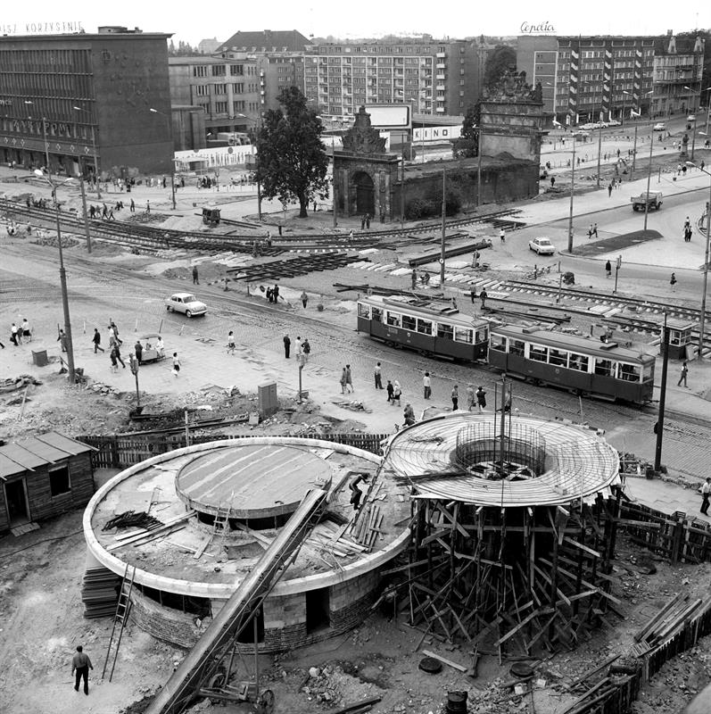 To zdjęcie pochodzi z lat 60., gdy przebudowywano stary układ torów tramwajowych na Bramie Portowej. Autorem fotografii jest znany szczeciński fotografik Marek Czasnojć. Widać, jak wiele się zmieniło. Wtedy zbudowano tzw. grzybek, czyli okrąglak, w którym znalazła się m.in. kasa biletowa i (chyba) dyspozytornia komunikacji miejskiej. To pod tym budyneczkiem starsze panie dokarmiały dziesiątki gołębi, które zlatywały się w to miejsce. W tle za zabytkową bramą majaczy ekran i napis „kino”. To było słynne „Derby”, gdzie pod chmurką można było obejrzeć najświeższe produkcie filmowe czasów PRL-u (czasem amerykańskie). Dziś budynek dawnego domu towarowego „Posejdon” rozbudowano. Zniknął też okrągły budyneczek. Zbudowano za to dwa wielkie biurowce o nazwach nawiązujących do tego miejsca – „Brama Portowa 1” i „Brama Portowa 2”.