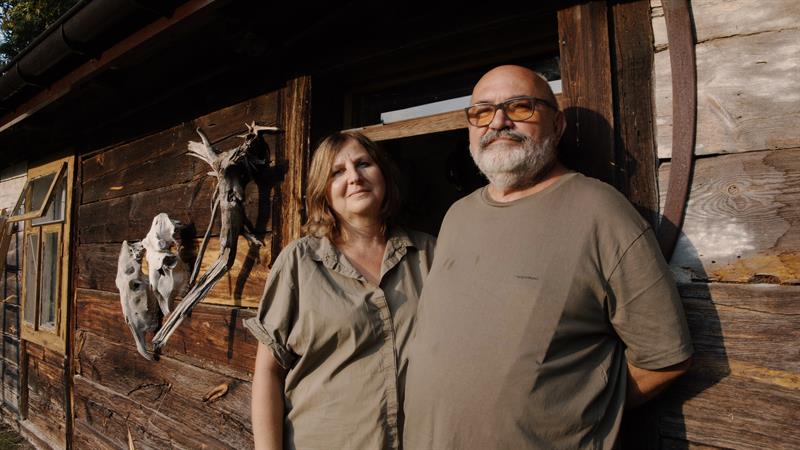 Na zdjęciu: Leszek Żebrowski z żoną Mirką przed rodzinną chatą w Szelkowie