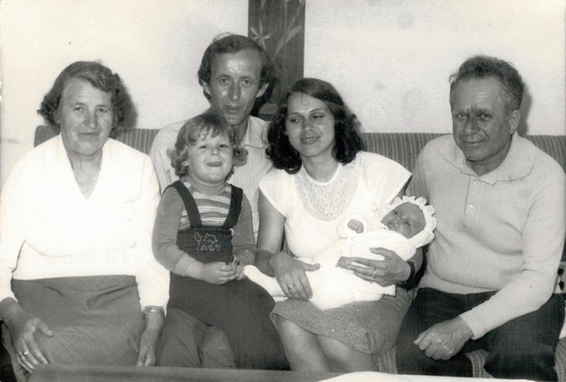 Czerwiec 1981 rok. Barbara i Stefan Adamczyk z czteroletnim Ignasiem i dwumiesięczną Sabinką oraz dziadkowie, Zofia i Czesław Adamczyk. Fot. archiwum rodzinne