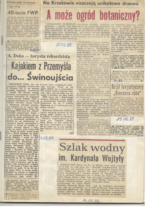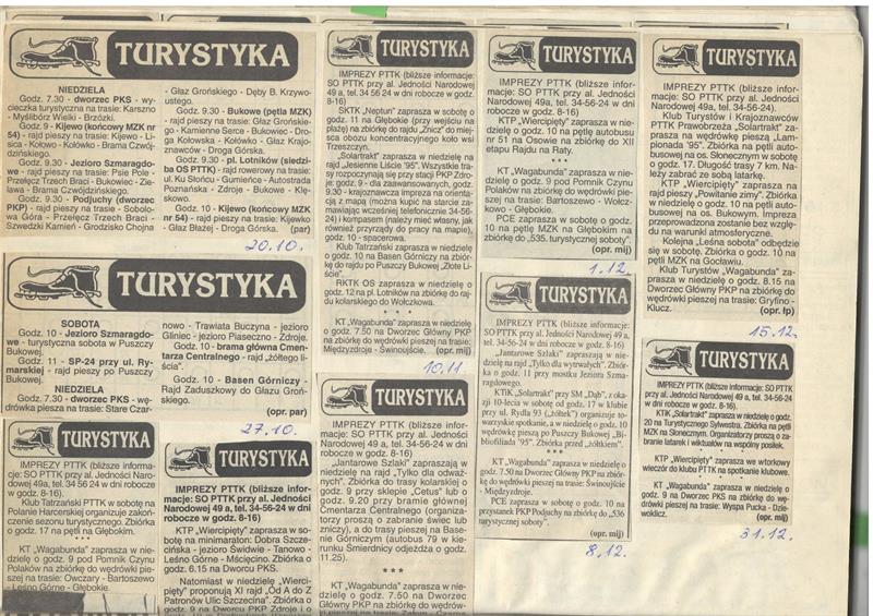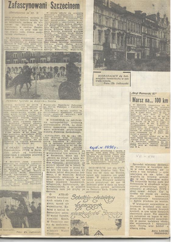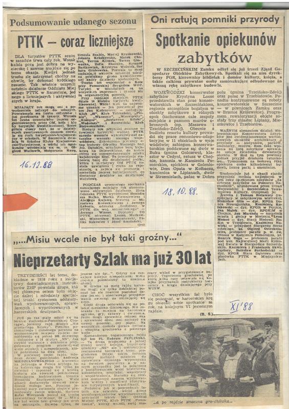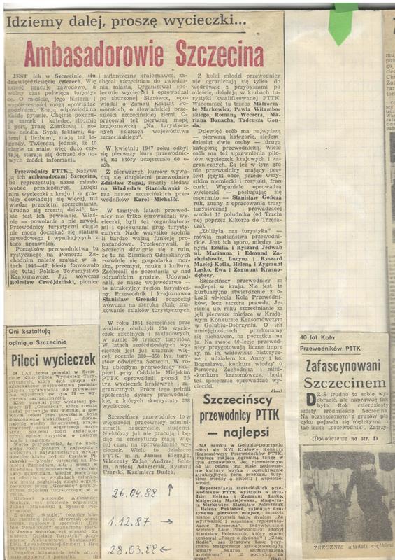 Nazbierało się tego sporo. Dyżurującym w Regionalnej Pracowni Krajoznawczej będąc przy ul. Dworcowej 6, gdzie komputer dostępny był, to oprócz tradycyjnej kartoteki wycinków  - współtworzyłam ją z Jankiem Krzysztoniem - wiedzę już można było w Książnicy Pomorskiej, w Pracowni Pomorzoznawczej zdobywać. Poza pracą zawodową i ta pasja wolontariacka wymagała poświęcenia, czasu i pieniędzy na, chociażby, wyjazdy po województwie, gdy sami lub z Koszalinem organizowaliśmy te 50 wojewódzkich zlotów; na szkolenia i egzaminy w przodujących regionach, na pracę w Regionalnej Komisji Turystyki Pieszej przy Zachodniopomorskim Oddziale PTTK. Mam licencję przewodnika miejskiego i terenowego, pilota turystycznego, Honorowego Przodownika Turystyki Pieszej PTTK, Instruktora Krajoznawstwa Regionu - wiele odznak i odznaczeń za poświęcenie i trud fizyczny, zmęczenie, ale zysk dla zdrowia, przyjemność, swoisty niewymuszony trening, [lepszy] niż w dusznym pomieszczeniu siłowni. Park, las, puszcza (mamy trzy wokół miasta) daje możliwości, my wykorzystujemy je szczególnie i nie tylko dla siebie. PTTK znakuje szlaki, dba o nie, odnawia, edukuje społeczeństwo myślące, „to nic nie kosztuje to... was nie widzę”.