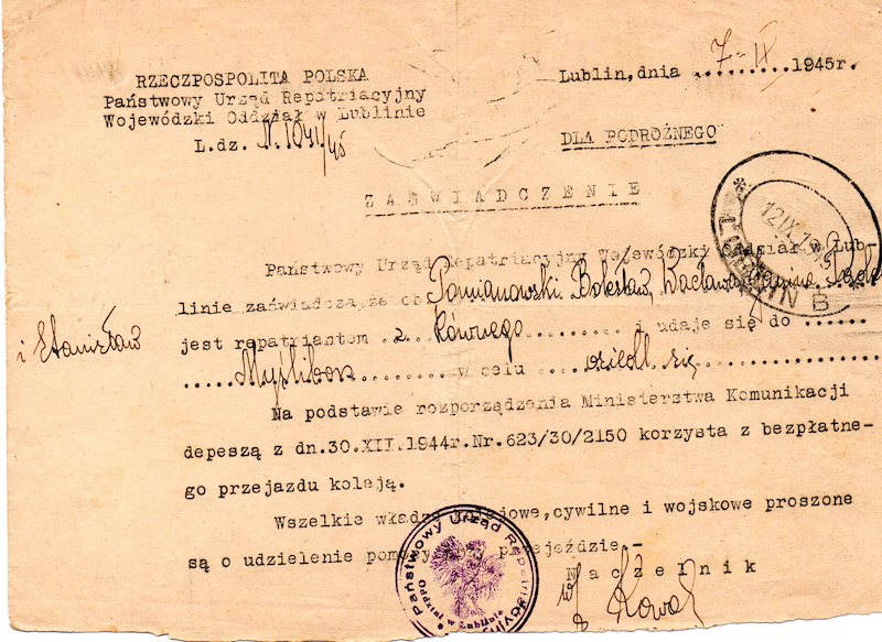 Bolesław podejmuje pracę w swoim zawodzie jako pracownik Urzędu Skarbowego Akcyzy i Monopolu Państwowego i przenosi się do Lublina. Od grudnia 1944 do czerwca 1945 pracuje na stałym dozorze skarbowym cukrowni Garbów i gorzelni Żyrzyn. Pomianowscy, jako przedwojenni mieszkańcy ziem polskich wcielonych do ZSRR, zostali przesiedleni na Ziemie Zachodnie, nazywane w tym czasie potocznie „Ziemiami Odzyskanymi”. 7 września 1945 r. otrzymali zaświadczenie uprawniające na transport z Lublina do Myśliborza oraz, 13 września, zaświadczenie przesiedleńcze i następnego dnia z dziećmi – Janiną, Stanisławem i Tadeuszem, oraz z podręcznym bagażem, ruszyli na Zachód. Pociąg dotarł na miejsce 22 września 1945 r. Nr karty ewakuacyjnej – 3479.