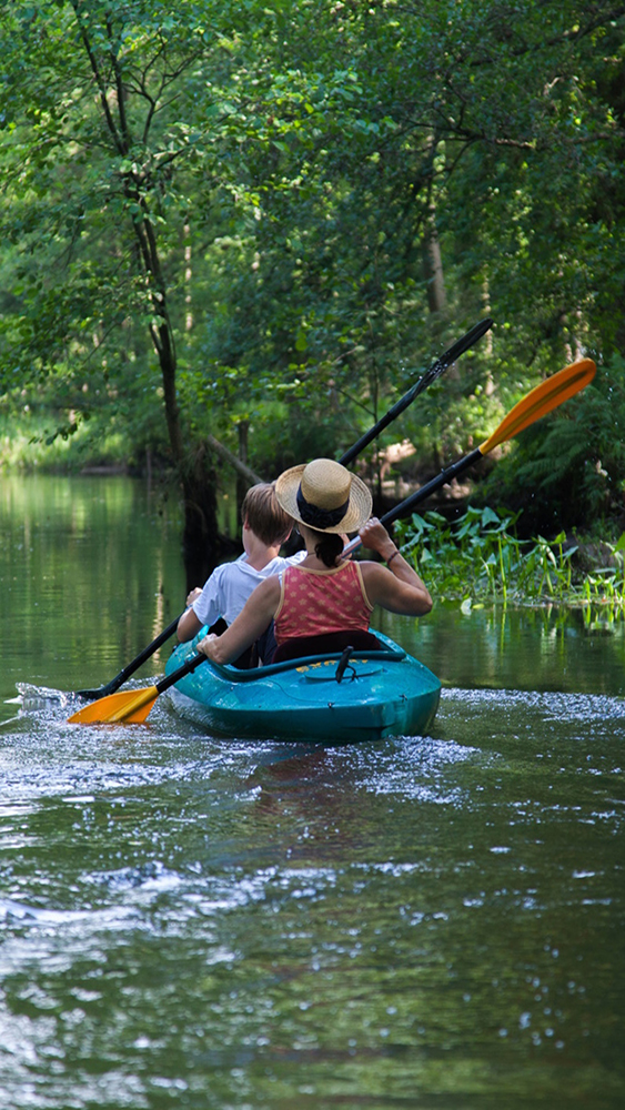Odkrywanie Brandenburgii z poziomu wody daje okazję do spotkania bobrów, wydr i bocianów. Dostępnych jest tutaj wiele szlaków kajakowych, które są odpowiednie zarówno dla początkujących, jak i doświadczonych kajakarzy. Trasa Burger Fish Pass w Spreewaldzie jest zalecana dla początkujących. Ten 4 km okrężny szlak prowadzi wzdłuż brzegów zabudowanych tradycyjnymi szprewaldzkimi domami, a rozpoczyna się i kończy w miejscowości Burg (Spreewald).