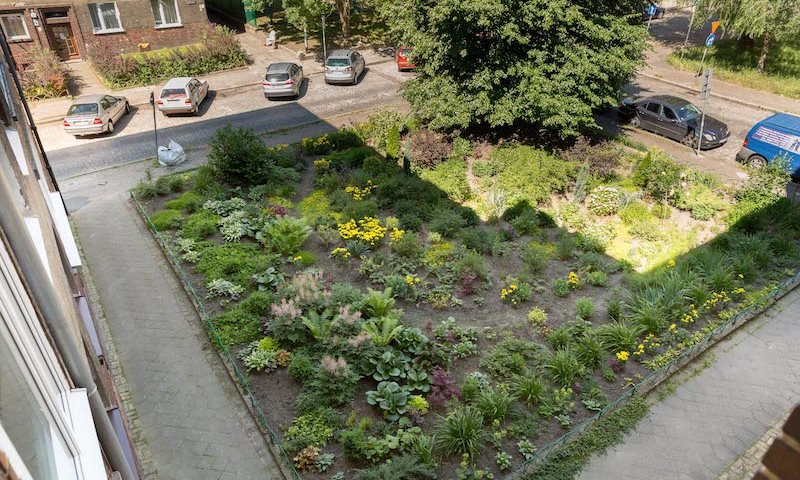 Bluszcz irlandzki puściła po murze i zdezelowanej poręczy schodów, by nieco oswoić ich brzdotę. Karmnikiem ościstym wypełniła dziury między cegłami. Sama z betonu wylała donice, które teraz obok rozkwitają czerwonymi pelargoniami pośród kocanek i rozchodników. Opodal rozciąga się skarpa, na której zakładała pierwszy z przydomowych ogrodów - od strony ul. Ejsmonda. Dwa następne przyciągają uwagę przechodniów od ul. Rodziewiczówny i od frontu - ul. Reja.