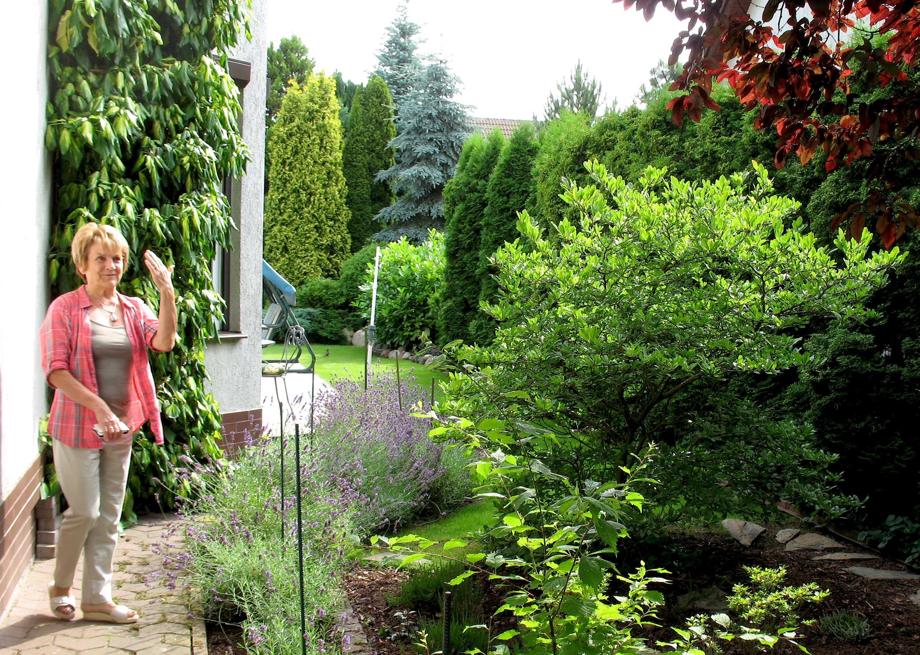 Od ulicy ogród jest oddzielony ścianą z wysokich tui i cyprysów, sięgających ponad kalenicę. Za nią, na tle bluszczu porastającego mury, uwagę przyciągają wielkie kępy kwitnących krzewów: hortensji i różaneczników. Okolone klombem z jodłą kanadyjską, sosną czarną i płożącymi jałowcami. Za nimi magnolie gwiaździste na tle śliwowiśni.