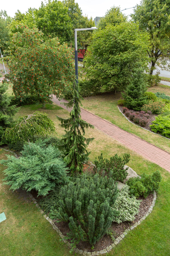 Zostały więc zaaranżowane zieleńce, stylistycznie zróżnicowane, a połączone nieskazitelnie równym i zielonym trawnikiem. W czym niemała zasługa stałej pielęgnacji (przycinanie co tydzień, nawożenie co 2 miesiące, wiosenna wertykulacja), ale też zamontowanego systemu nawadniania (kropelkowy wraz ze zraszaczami).