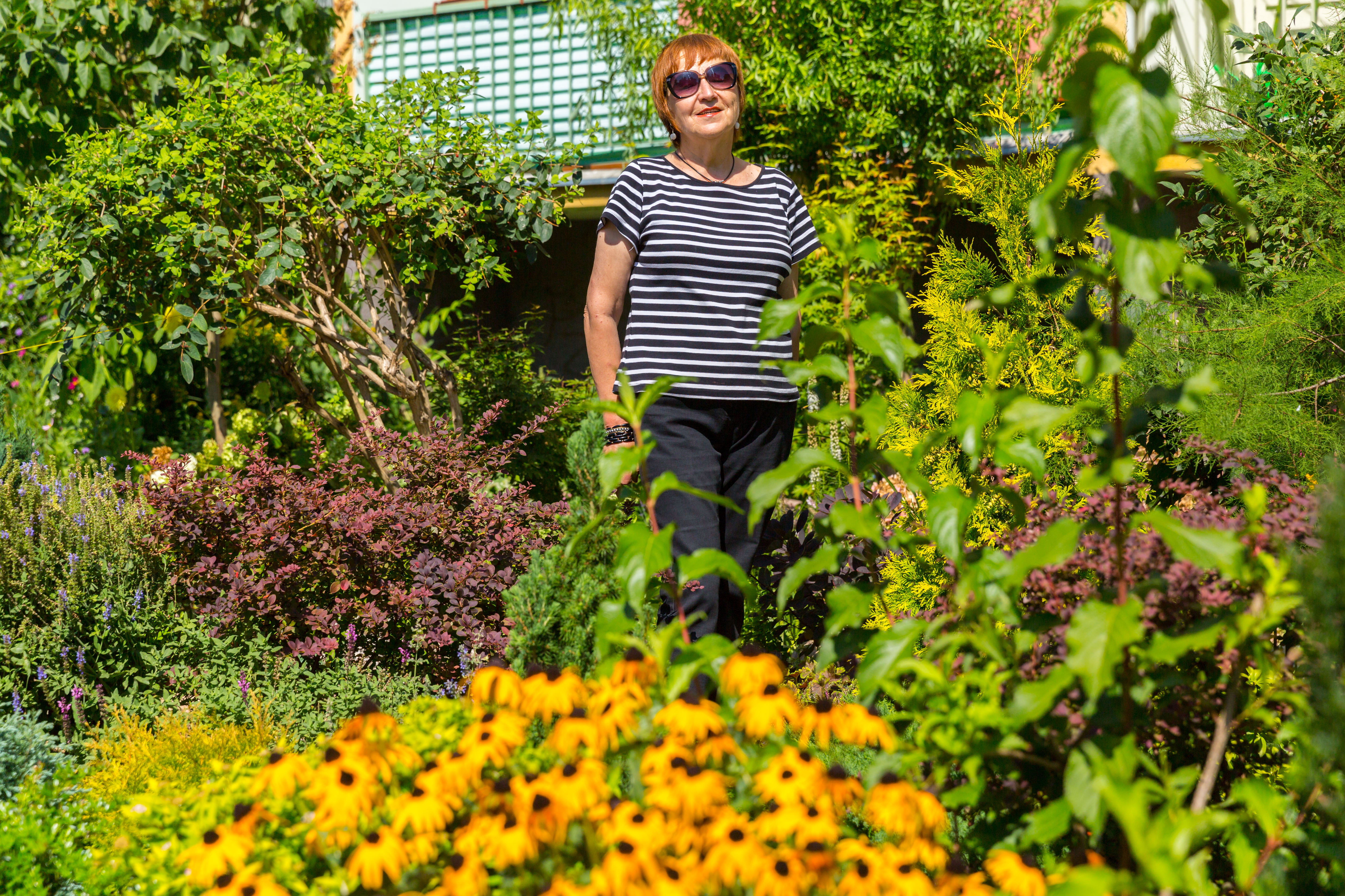 na zdjęciu: Ewa Drozd-Pokorska i jej zieleniec malowany kwiatami i kolorami