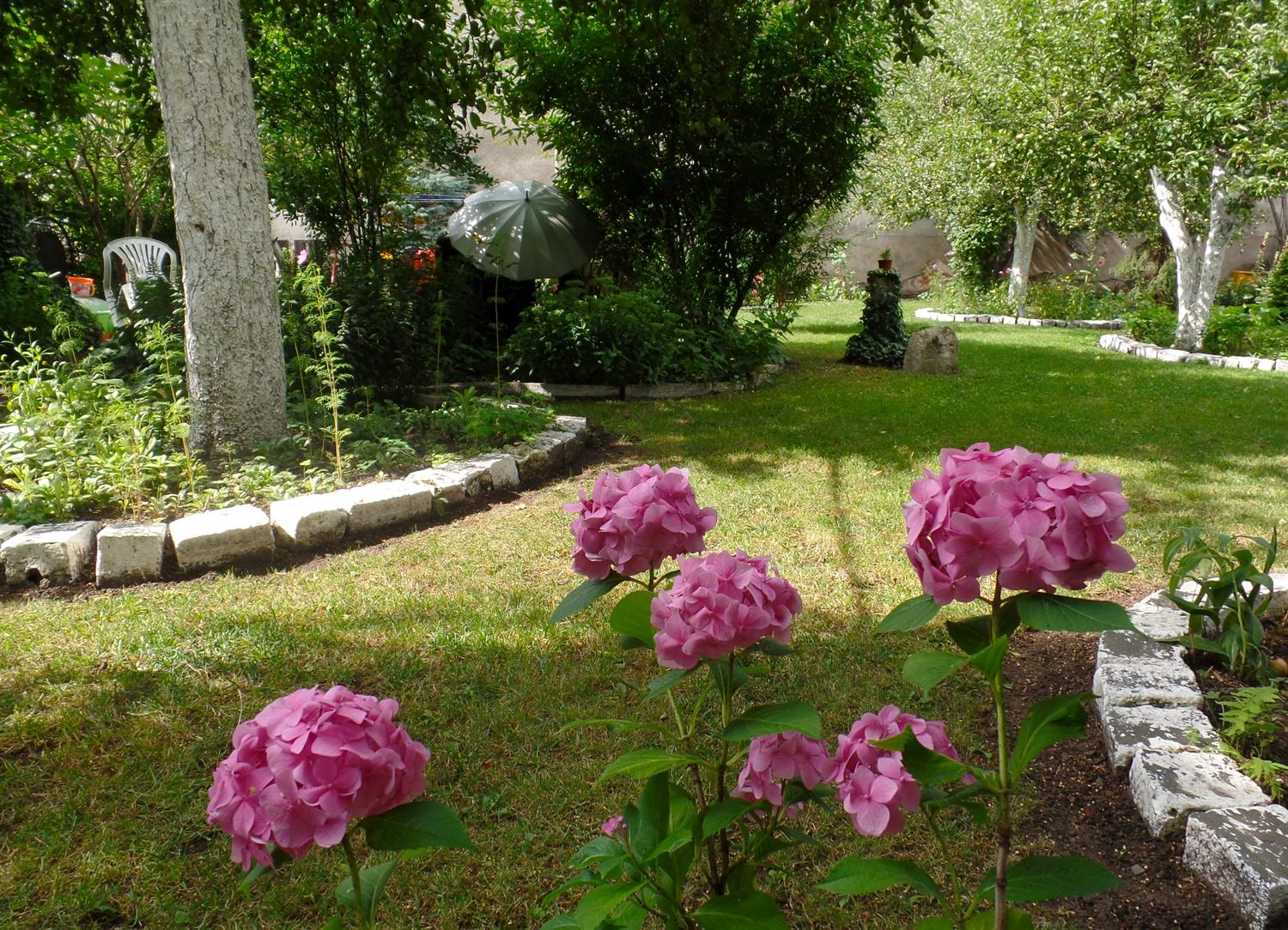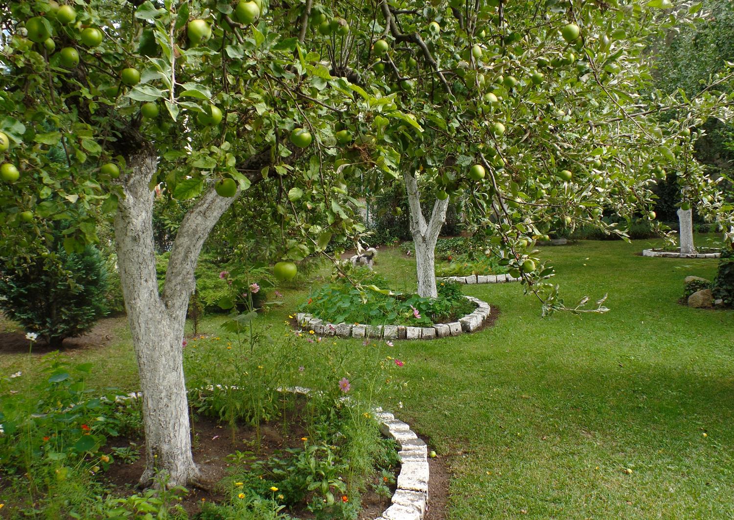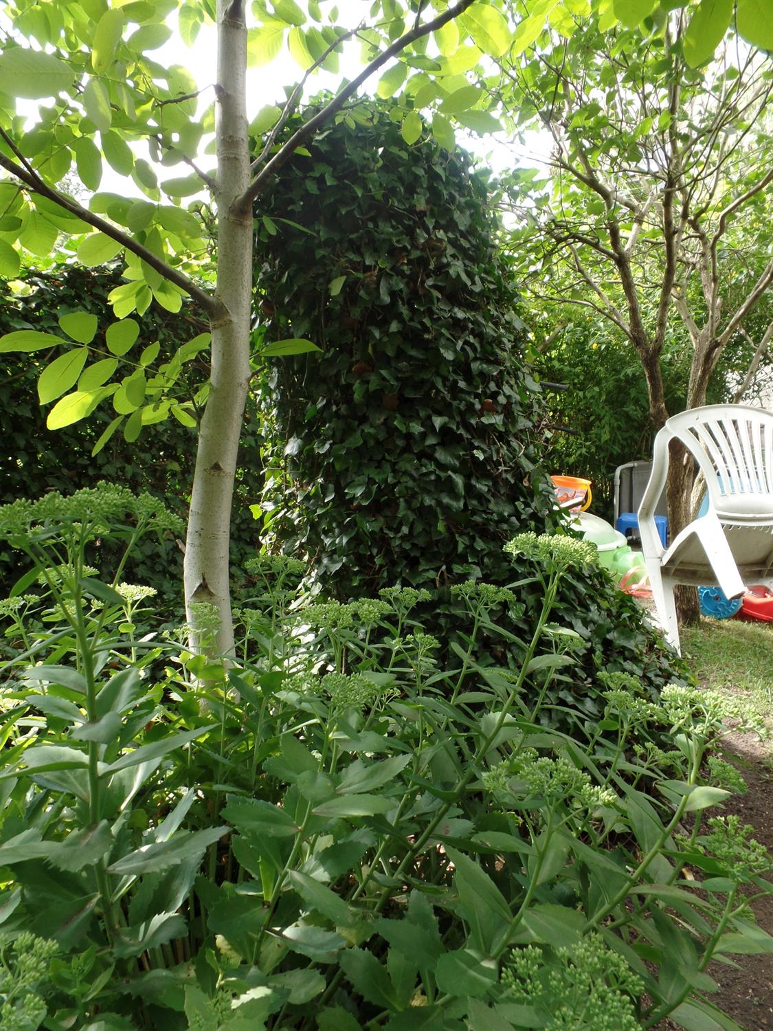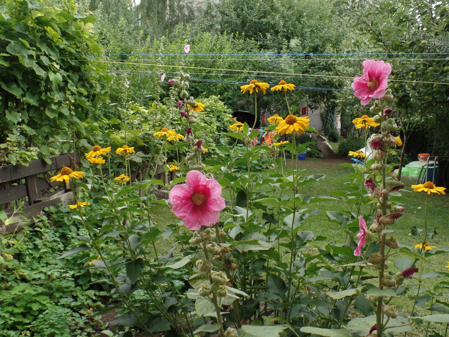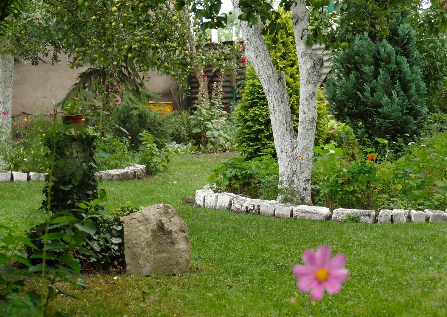Na 400 metrach kwadratowych znalazło się miejsce na różne ogrodowe strefy. W jednej jest świerkowy zagajnik, w którym co święta przybywa nowy iglak. Obok niego - brzozy i jarzębina sięgają już szczytów obu sąsiednich kamienic. Pomiędzy nimi przycupnęła namiastka sadu: kilka jabłoni, wokół których pni rozkwitają kobierce kosmosów, nagietków, rudbekii. W całym ogrodzie uwagę przyciągają strzeliste malwy, także przy - teraz ozdobnych tylko zielonymi liśćmi - lilakach i konwaliach. Widać kępy złocieńców, hortensji, rozchodników, a też nasturcji obsypanych jadalnymi kwiatami, co pną się bujnie po krzewach lub płożą po rozległym trawniku. Do tego winogron - istną zieloną ścianą - rozrósł się tak, że wyznacza oś strefy wypoczynkowej ogrodu: ze stolikiem i siedziskami.