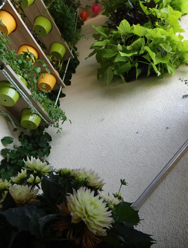 W jednym z narożników przy ścianie zgrabna konstrukcja z deseczek na linach. To teraz kącik warzywno-zielarski z półeczkami na donice. A w nich miniaturowe dojrzewające pomidorki, papryczki i truskawki. A tuż obok i pod nimi dwa krzesełka i stolik, czyli skrojony na miarę kącik wypoczynku.