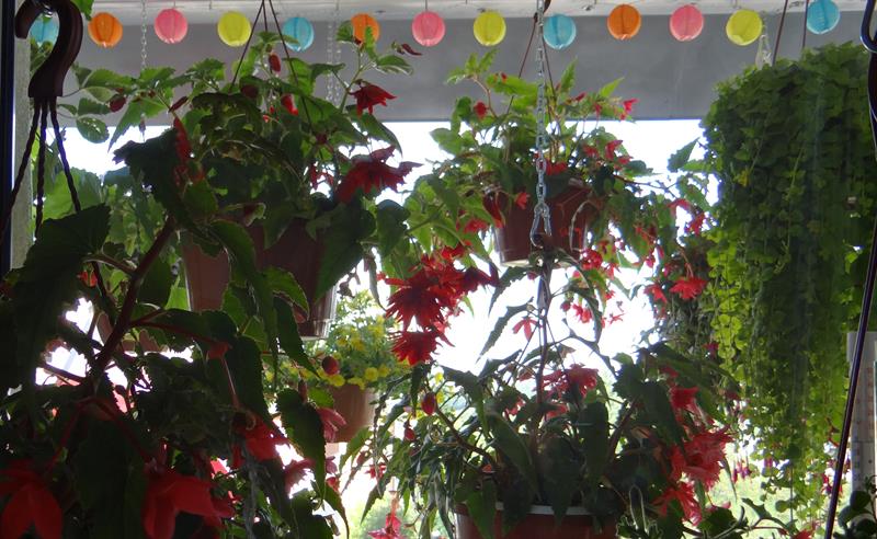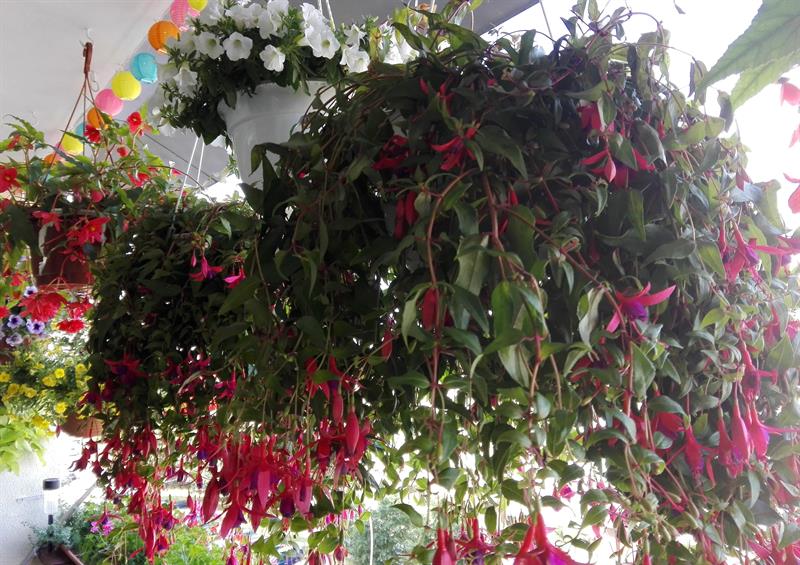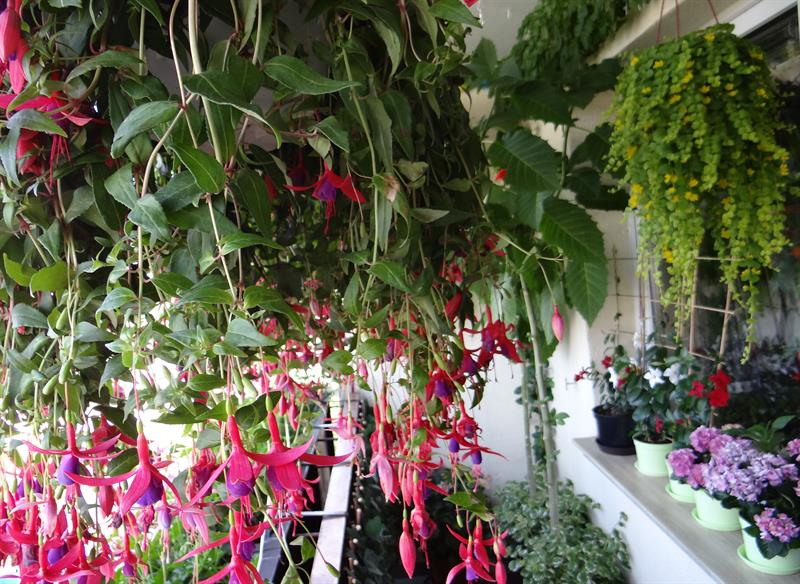 Są też hortensje. Te wspólnie z sundarwillą zdobią parapety. W podwieszonych do sufitu donicach – fuksje, begonie. Poza tym kurdybanek, komarzyce, a po bokach w donicach krzewy dorodnych astrów. Na swój czas czekają okazałe datury. Z uwagi na rozmiary wymagają cięcia. Za to potem i za pielęgnację w czasie zimy odwdzięczają się gospodarzom pięknymi kielichami kwiatów.