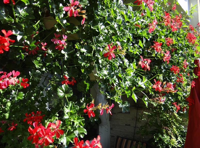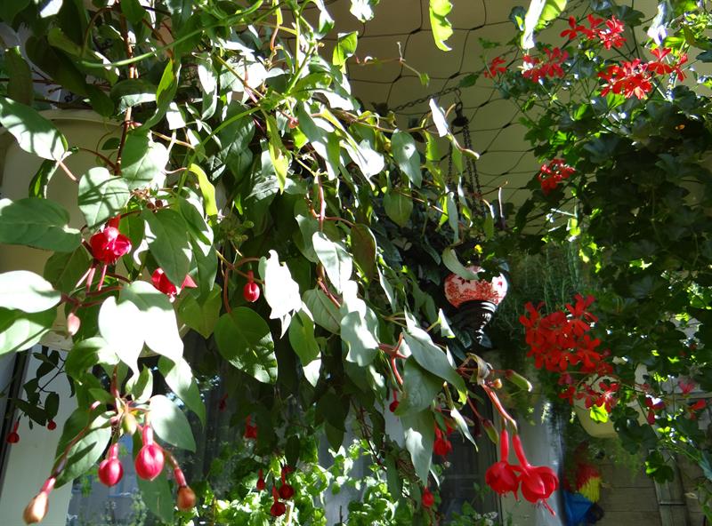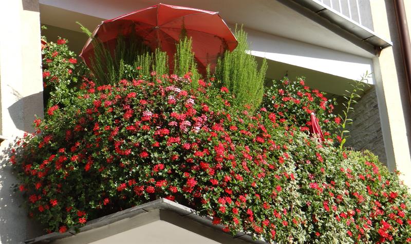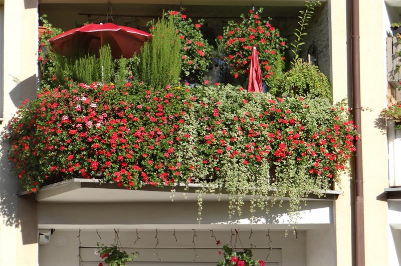 Dominujące, bo najliczniejsze wśród kwiatów, tradycyjnie już są pelargonie rabatowe i kaskadowe. Niezmiennie w kolorze czerwonym. A wysadzaniem ich wiosną na balkony przez te wszystkie lata zdołała „zarazić” całkiem spore grono sąsiadów. Cieszy ją, że także dzięki ich zaangażowaniu przybywa w jej najbliższym otoczeniu ukwieconych balkonów. To taka – jak podkreśla – pozytywna infekcja.