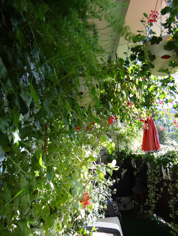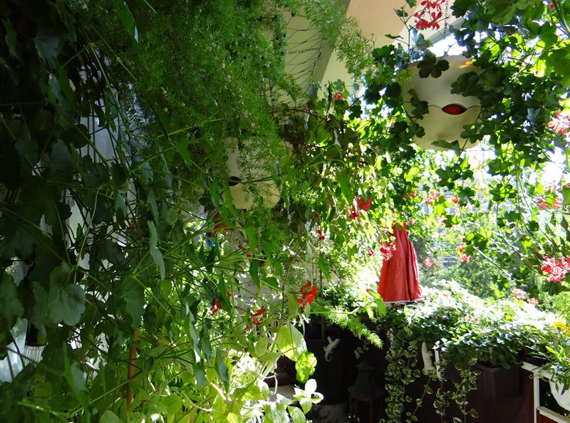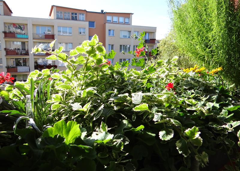 Kipiącą zielenią i kwiatami oazę pani Beaty w bloku przy Małopolskiej uzupełniają zielnik z trzema odmianami mięty, rozmarynem, bazylią i oregano oraz wierzba płacząca i mocowana nad nią do bocznej ściany fontanna, w której woda przelewa się kaskadowo z dzbanka do dzbanka. Pani Beata zdradza przy okazji receptę na to, jak w znakomitej kondycji rośliny udaje się utrzymywać przy jej licznych zawodowych i muzycznych pasjach.