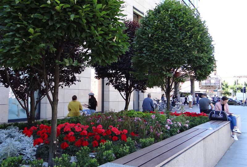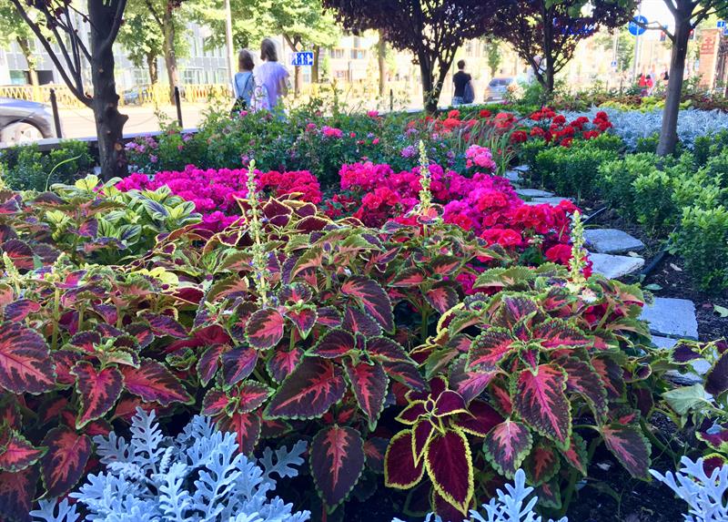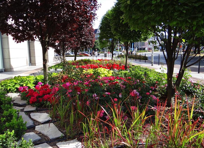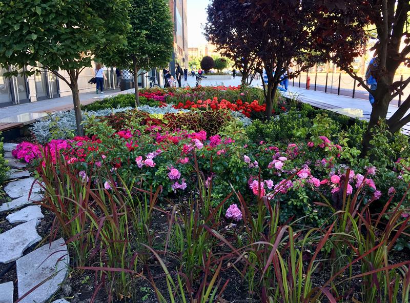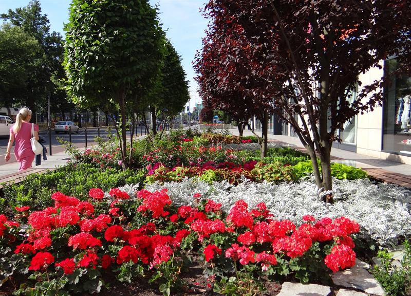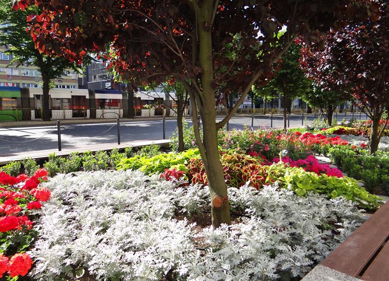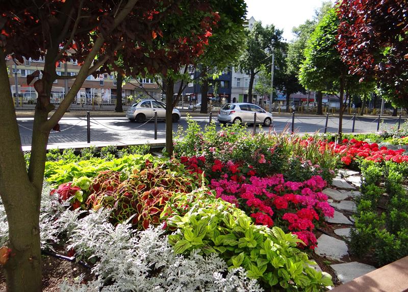 „Miejskie ogrody" przy Galerii Kaskada to wielobarwna tętniąca życiem mozaika, złożona ze 126 efektownych koleusów w odmianach, z pół tysiąca pelargonii rabatowych o energetycznych odcieniach różu i purpury, 90 krzewów róż okrywowych o drobnych pełnych kwiatach. Uzupełniona ozdobnymi trawami, czyli 144 imperatami cylindrycznymi, u których nasady brunatny kolor przechodzi w zieleń, aby przebarwić się na bordowo w końcówkach „ostrych" liści. To w kontraście do srebrzystych miękkich starców, których 540 sadzonek współgra z 660 krzewami bukszpanu wieczniezielonego. Pomiędzy nimi widać kamienie. Natomiast nad nimi górują zielone graby o odmianie kolumnowej oraz śliwy wiśniowe 'Pissarda'.