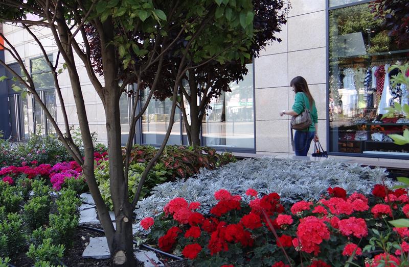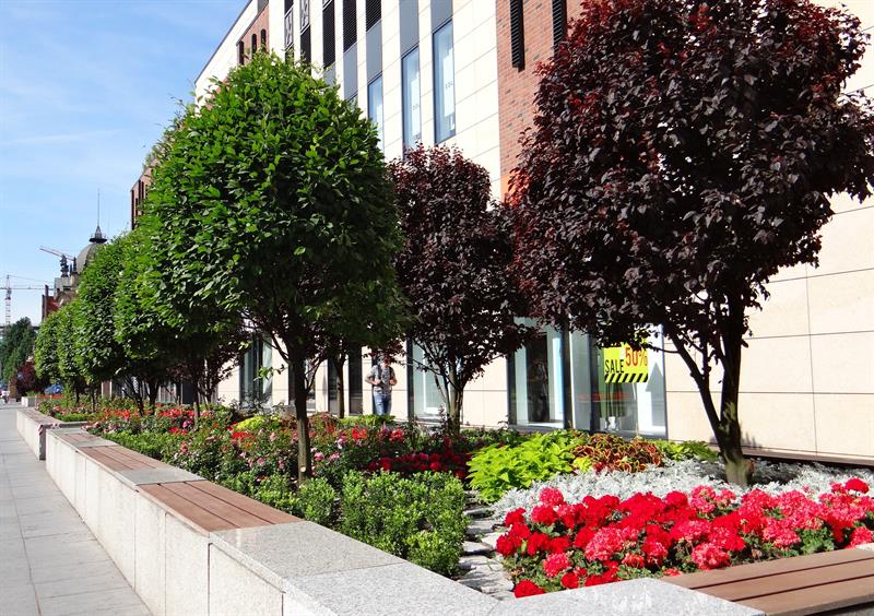 W owym wydaniu „miejskie ogrody" przy galerii były tyleż poprawne, ileż nudne. Teraz w nich zaszła wielka zmiana. Za sprawą feerii barw, zestawień ciekawych gatunków i odmian roślin, tworzących harmonijną całość różnorodnych faktur, pokroju i kształtów: od płatków po liście. Czytelnie oddając ideę miejsca, w którym „styl spotyka się z pasją, codzienne obowiązki z rozrywką, a brzmienie miasta z kojącą naturą".