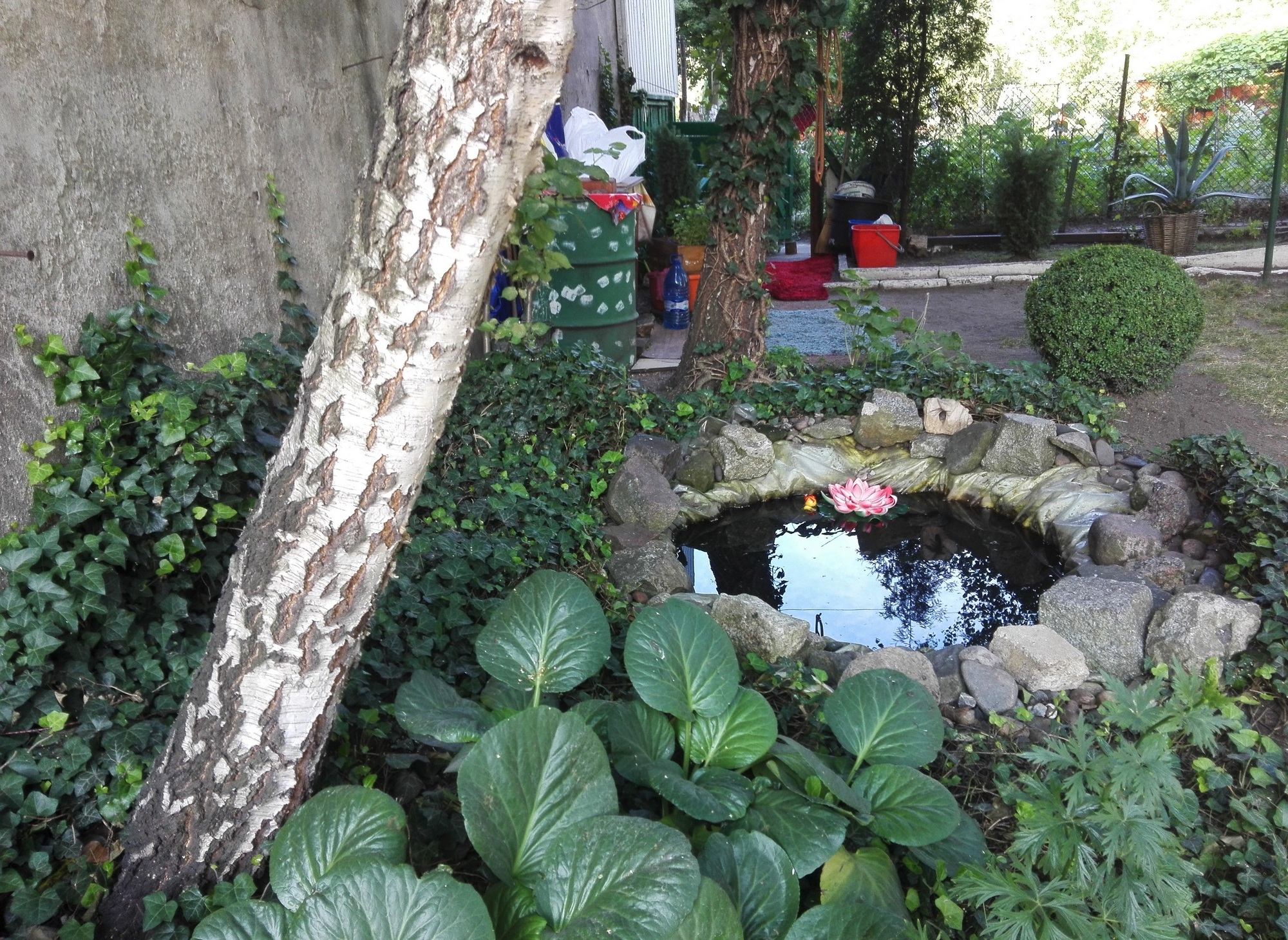 – Mieszkam tu niemal od zawsze. Przez dwadzieścia lat, aż do renty, pracowałam w pobliskiej drogerii. Wszyscy mnie tu znają. Cieszy mnie ich życzliwość. Dlatego zawsze powtarzam, że mój dom i ogród są otwarte dla dobrych ludzi. A szczęście do nich miałam. Wygląda na to, że mam też szczęście do roślin. Większość tych, które tu teraz rosną, pochodzą z mojej własnej uprawy, jak choćby te bluszcze pnące się wokół pni części drzew i płożące się przy ścianie szczytowej kamienicy wokół wodnego oczka. Jakże dumna byłam z pięknych wysokich malw, ale w tym roku ich nie ma – martwi się pani Grażyna. – Zimą chyba wymarzły. Posadziłam nowe. Jest też kilka nowych krzewów tuj i hortensji.