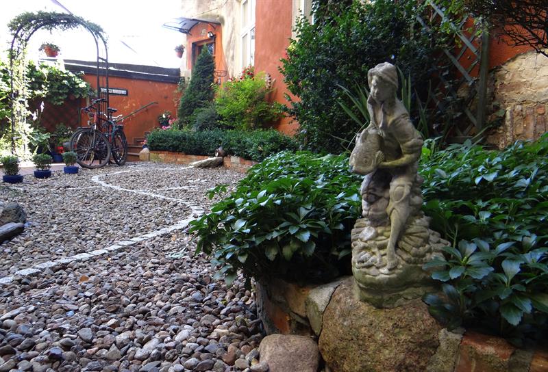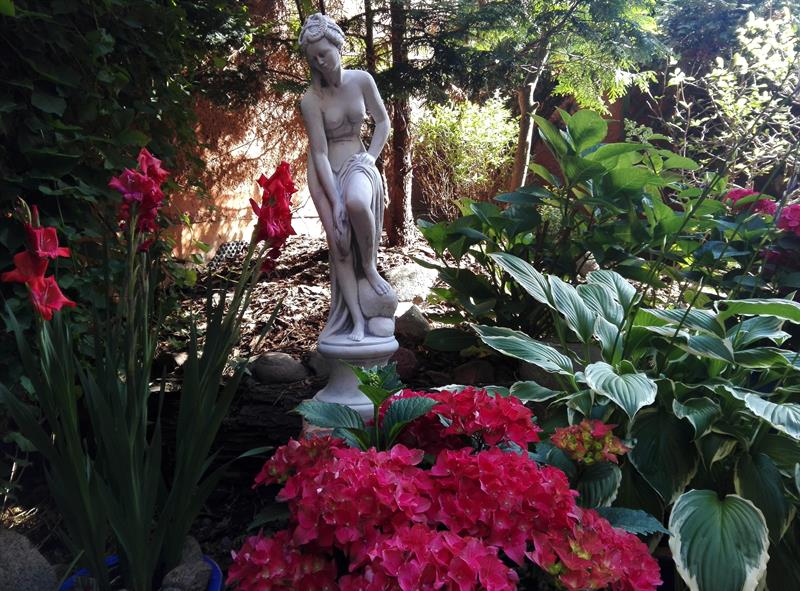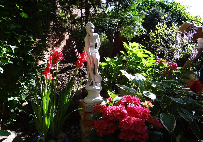 To miejsce wciąż się przeobraża. Stopniowo, rok po roku. I tak już od ponad dekady. Gdzie nie spojrzeć, to coś znów przykuwa wzrok. Raz jest nim stara ocynkowana konewka za ławeczkami i stolikiem. To znów mała fontanna z kamienia w kształcie figurki chłopca z rybką na styku murku z przedwojennej cegły i odcinającego się wyraźnie od niego pasa przestrzeni wysypanej kamykami. Innym razem intryguje skryta nieco wśród zieleni krzewów parka przytulających się i w geście pocałunku postaci. Takie sobie dwa aniołki wtulone w siebie i trzmieliny. A nieopodal stojak na rowery, oczywiście użyteczny, a wykonany z nikomu już niepotrzebnego fragmentu okiennej, ozdobnej kratownicy. To znów rzeźba Wenus oblewana ostatnimi promieniami przedpołudniowego słońca na skarpie. A w tle, idąc dalej wzdłuż ścieżki, kwitnąca na pomarańczowo "ściana" milinu amerykańskiego. Obrazy zmieniają się jak w kalejdoskopie, w zależności od miejsca, z którego patrzymy.