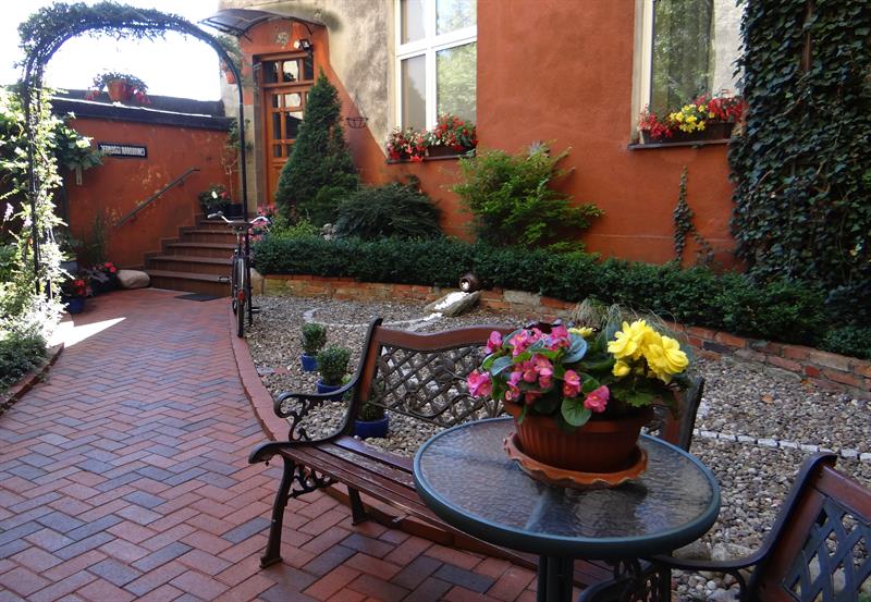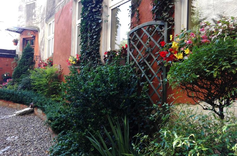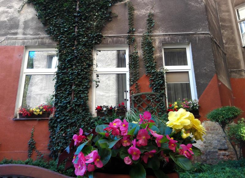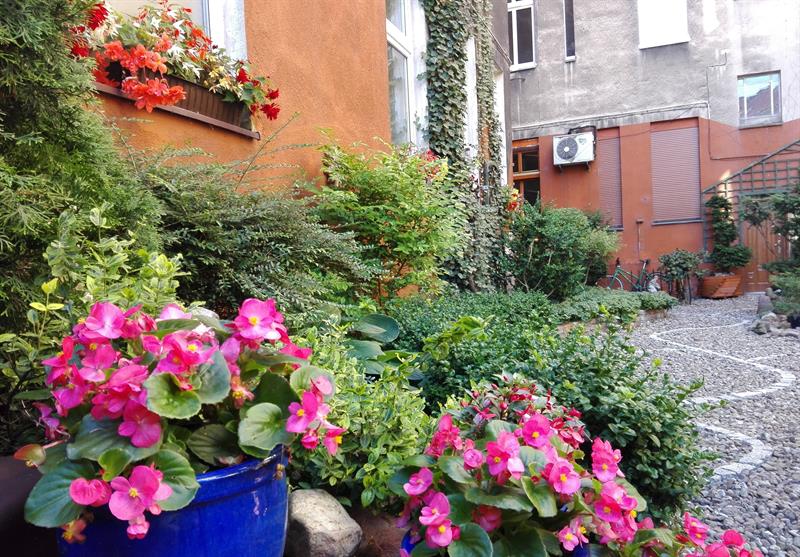 Wkoło bujna zieleń w każdym zakątku przeplatana roślinami sezonowymi, jednorocznymi. Rower sprzed dziesiątek lat, kupiony w punkcie skupu złomu za 15 zł – teraz w roli klombu z okazami komarzyc. Trzepak służący do zawieszania donic tym razem z kobiercami zwisających i kwitnących na fioletowo surfinii. Tuż obok skryta pod zielonym baldachimem liści rdestu huśtawka. Naprzeciwko odrapaną, z liszajami i obłupanymi kawałami tynku elewacji przesłaniające choć w części bluszcz oraz ściana zielonych nasadzeń i skrzynki begonii bądź pelargonii w kilku kolorach na parapetach okien w parterze. Na schodach prowadzących do oficyny też donice z begoniami. W innej części podwórka-ogrodu koleusy, funkie, fuksje, hortensje.