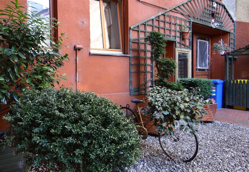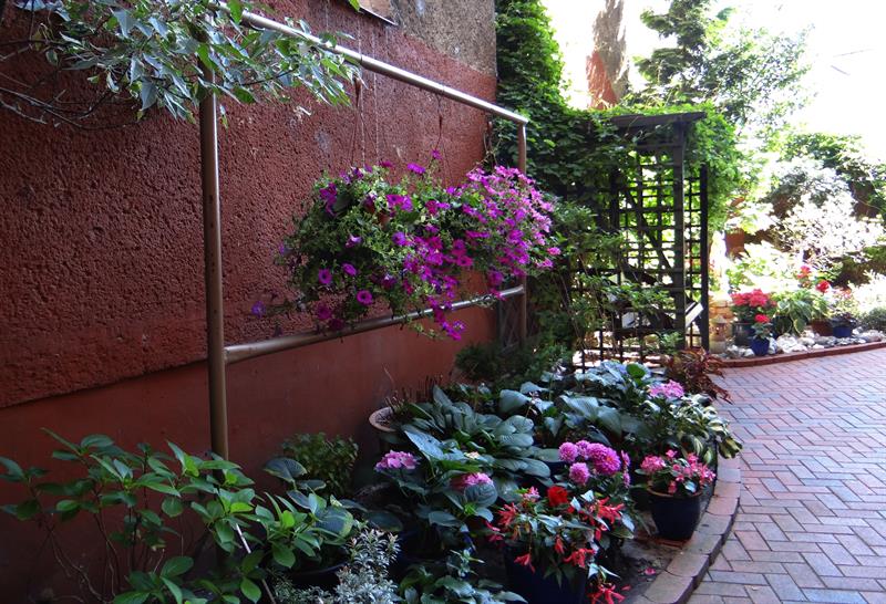 Dziedziniec między frontem a oficyną ograniczony jest murami garaży oraz sąsiedniej kamienicy. Tutaj słoneczne promienie docierają ledwie przez kilka godzin i nie więcej niż na trzy metry szerokim pasem do południa błądzą ledwie i nieśmiało po roślinach. Stad tez ich dobór, czyli w większości krzewy zimozielone i iglaki.