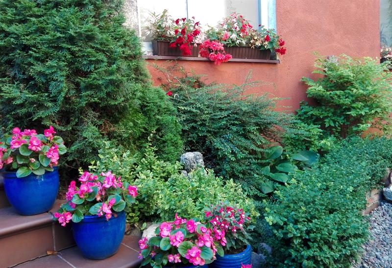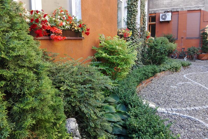 Uwagę przyciągają kolejne bujnie rozkrzewiające się ligustry, trzmieliny i żywotniki, a także hosty, bukszpany. Żywotniki i bukszpany urosły już na tyle, że dają się ciekawie formować. Przez część podwórkowego ogrodu pan Zbigniew poprowadził dwie kamienne ścieżki, czerpiąc inspirację z jednego przesłań filozofii Wschodu. Inną z nowości w stale zmieniającej się, kreowanej przez niego zielonej enklawie,ale zakładaną na stałe, są lustra, które optycznie powiększają i wzmacniają efekt przestrzenny.