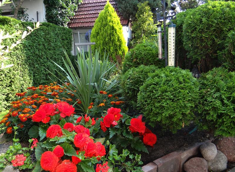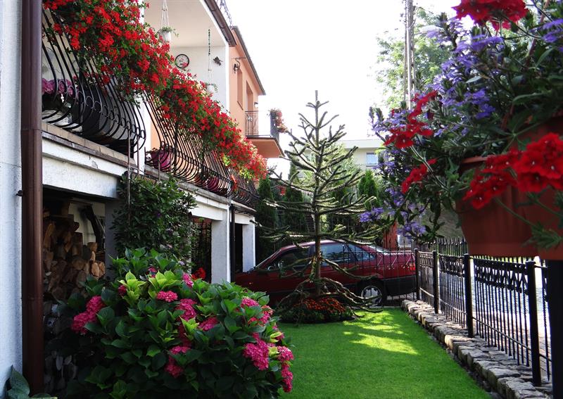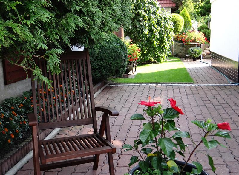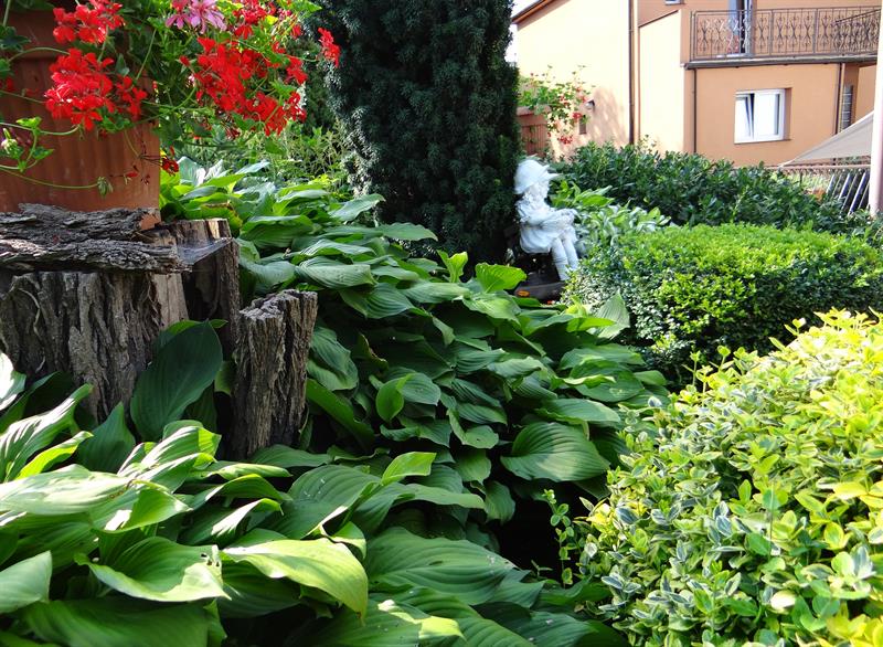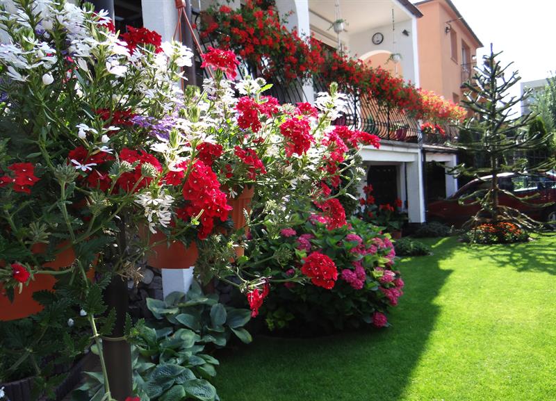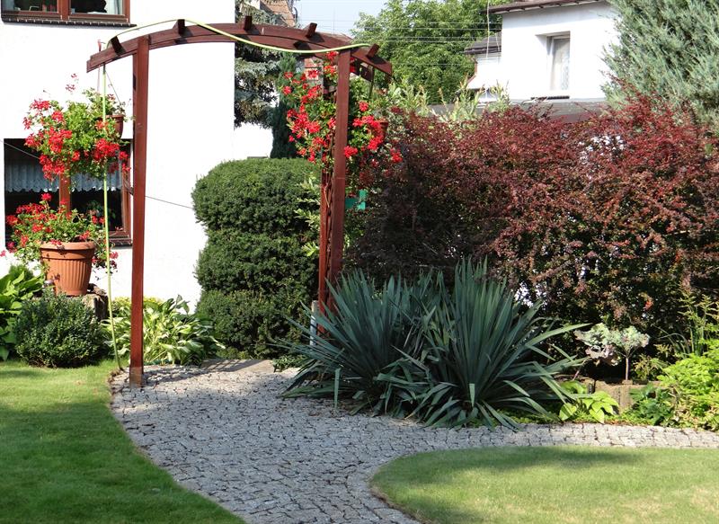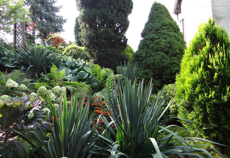 Od frontu zadbany trawnik przedogródka z okazem dorodnej araukarii i girlandą równie dorodnych czerwieniących się pelargonii, wielokolorowych werben, hortensjami i ketmiami to ledwie wstęp do zielono-kwiatowej oazy ze skarpą na tyłach ich domu. Tam właśnie rozpościera się prawdziwe ogrodowe królestwo Danuty i Wojciecha Spałków. Przy cichej uliczce Kamieńskiej w Dąbiu. Nie za duże, nie za małe, a właśnie takie w sam raz.