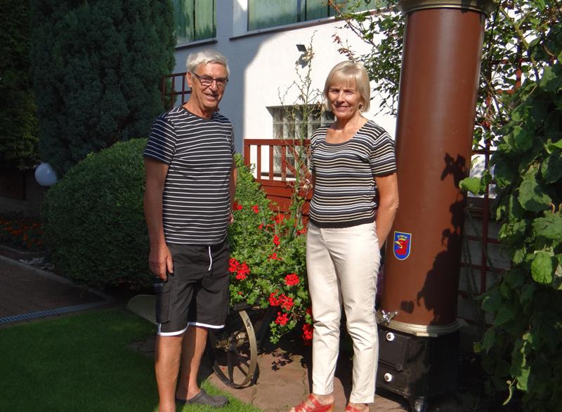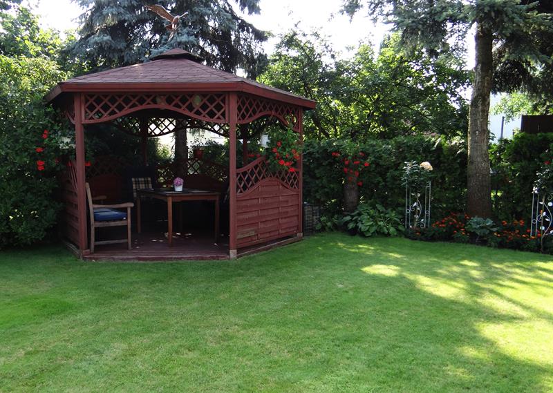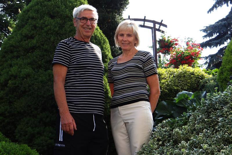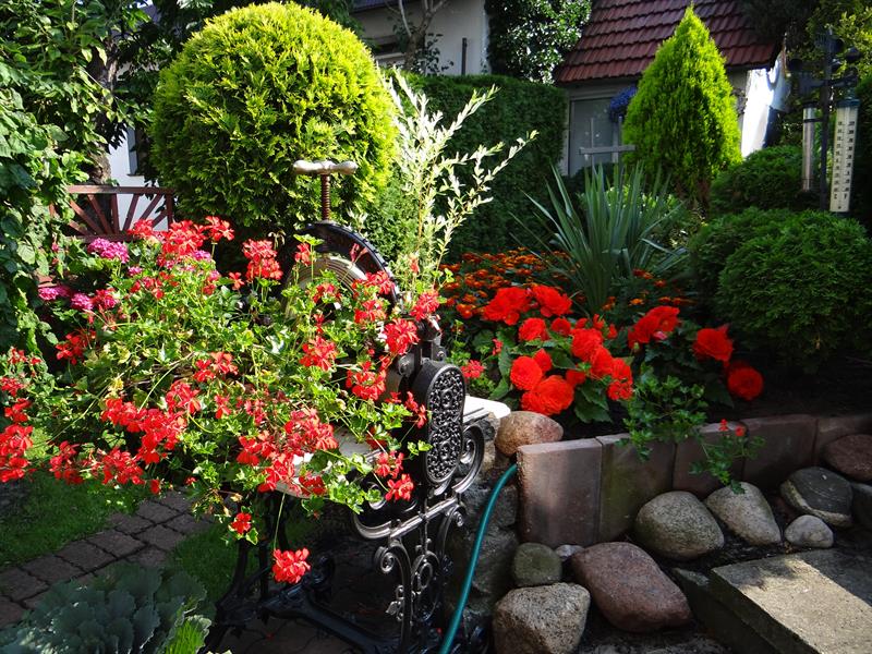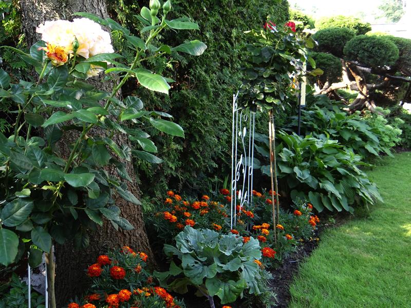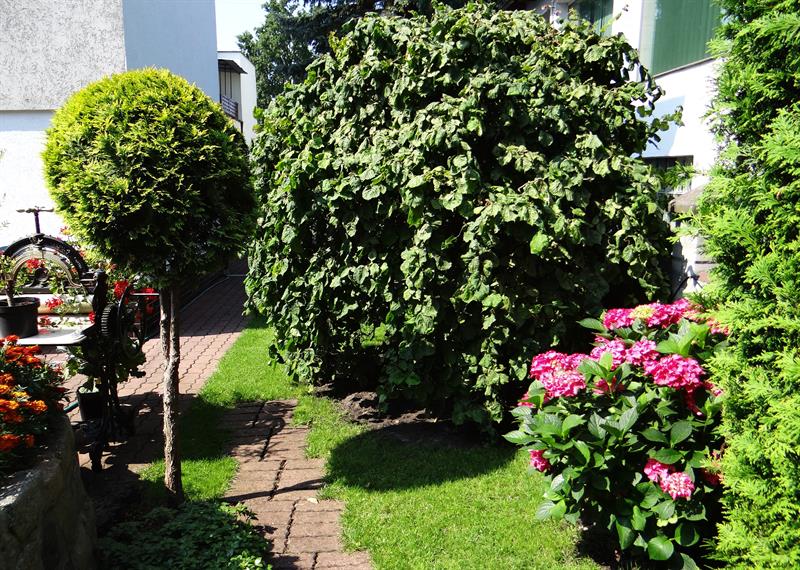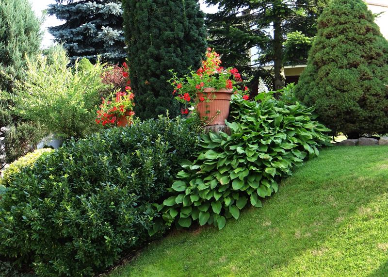 Od frontu zadbany trawnik przedogródka z okazem dorodnej araukarii i girlandą równie dorodnych czerwieniących się pelargonii, wielokolorowych werben, hortensjami i ketmiami to ledwie wstęp do zielono-kwiatowej oazy ze skarpą na tyłach ich domu. Tam właśnie rozpościera się prawdziwe ogrodowe królestwo Danuty i Wojciecha Spałków. Przy cichej uliczce Kamieńskiej w Dąbiu. Nie za duże, nie za małe, a właśnie takie w sam raz.