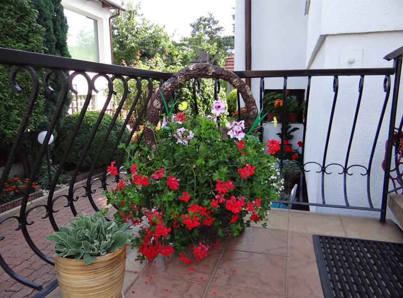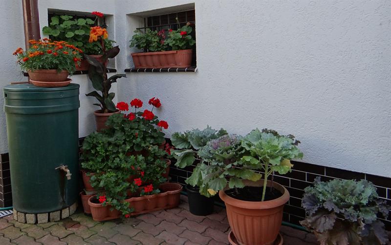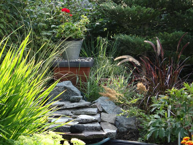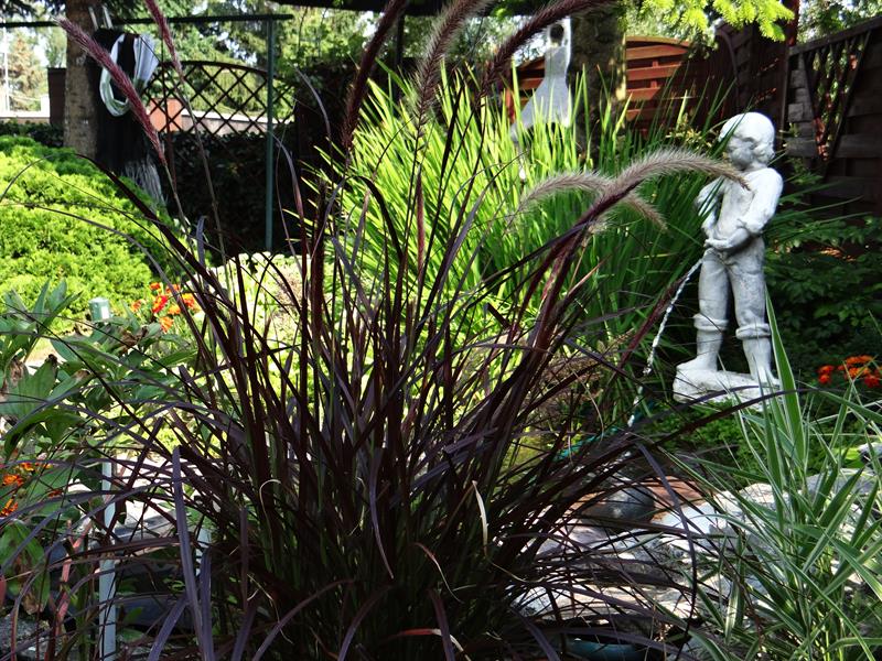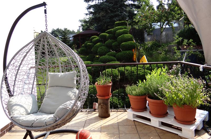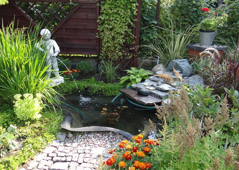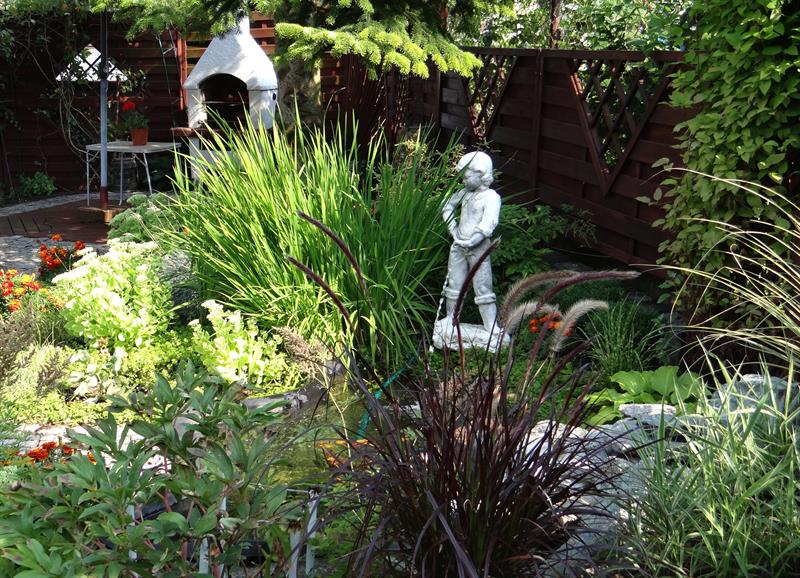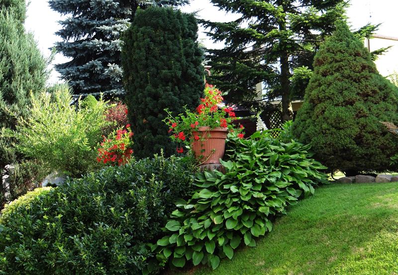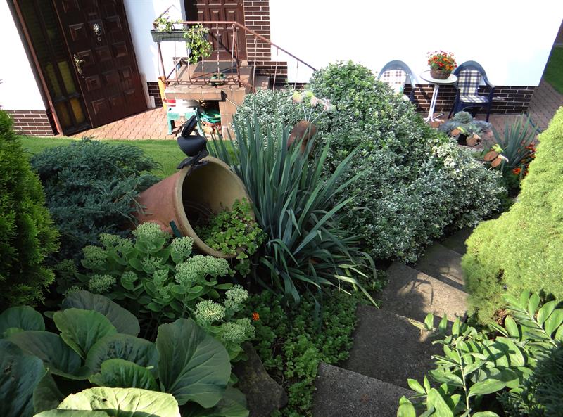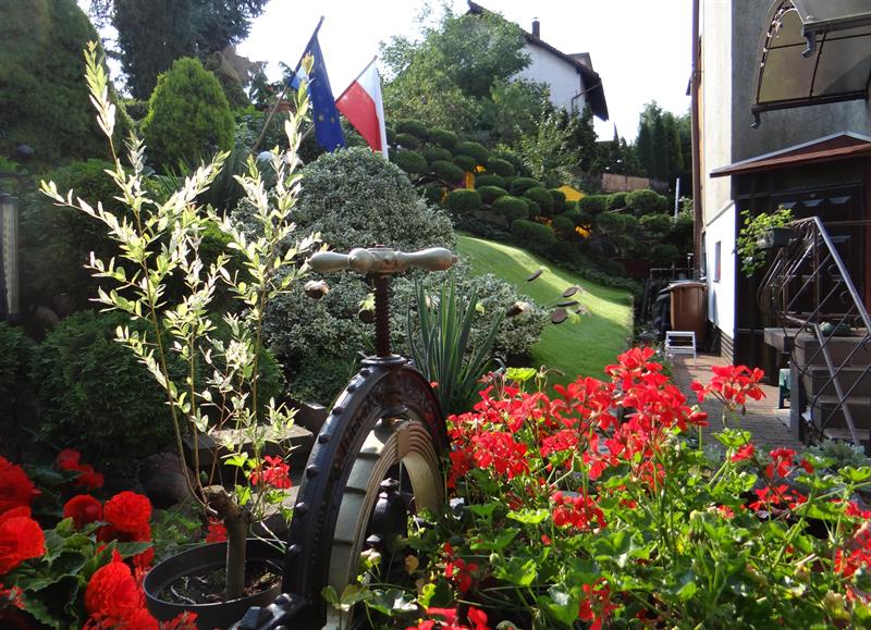Na górnym tarasie zadbany trawnik, altana do wypoczynku i osobny kącik grillowy, a między nimi oczko wodne z ozdobnymi trawami i tryskającą „minifontanką” – idealną niemal kopią figurki brukselskiego Manneken pisa, czyli sikającego chłopca. Po granicy działki rosną dorodne iglaki. Wśród nich świerki srebrny i syberyjski. Klimatu miejsca pełnego odcieni zieleni iglaków dopełniają juki, na rabatach i w donicach ozdobne kapusty, aksamitki, róże chińskie, z własnych upraw od kilku lat wysadzane do donic i skrzynek begonie i pelargonie, werbeny, kanny, a na rabatach tawułki. Naturalnym zaś przedłużeniem zielono-kwiatowej przestrzeni jest taras z urządzonym na nim zielnikiem.