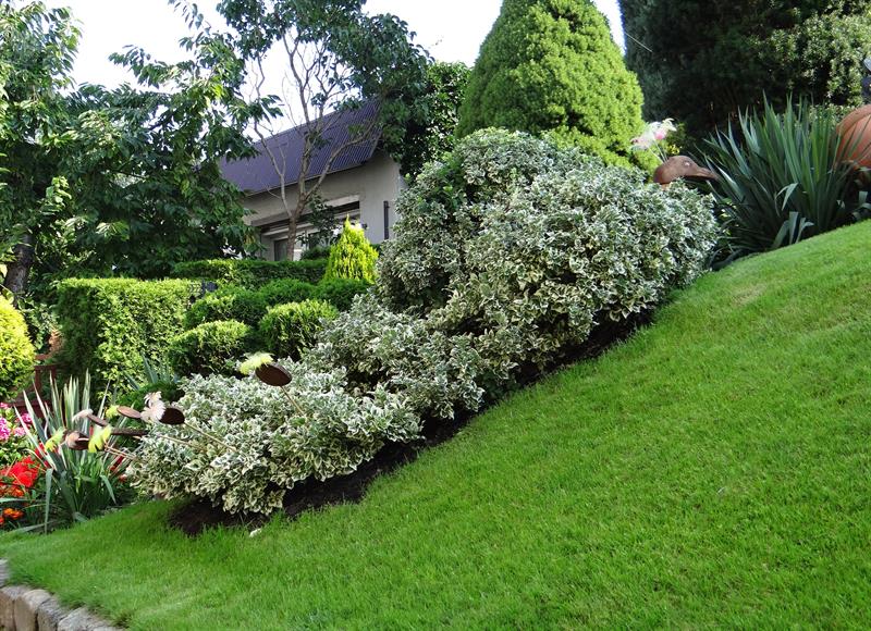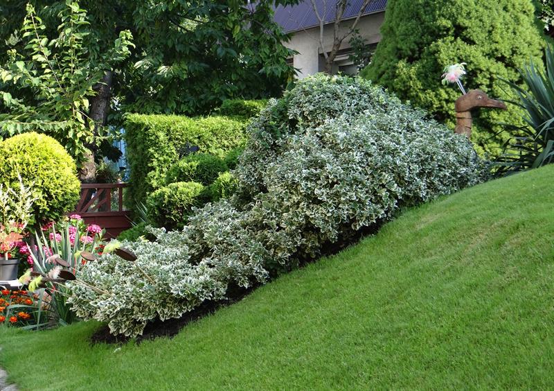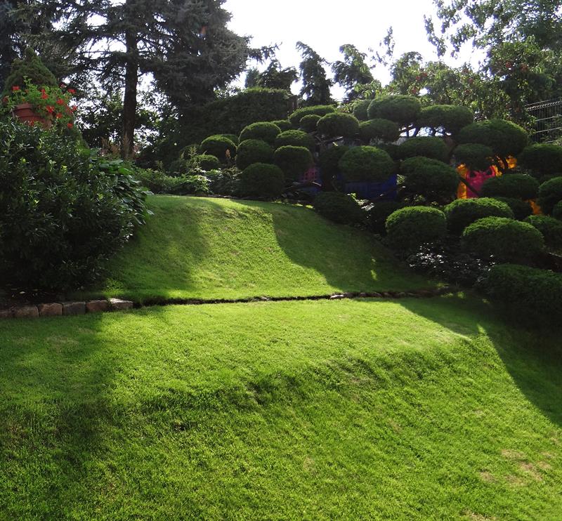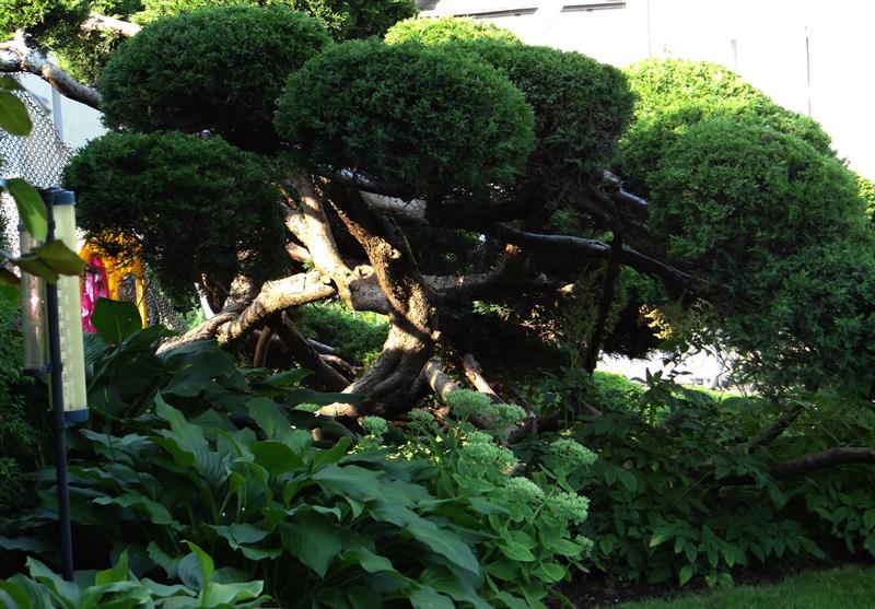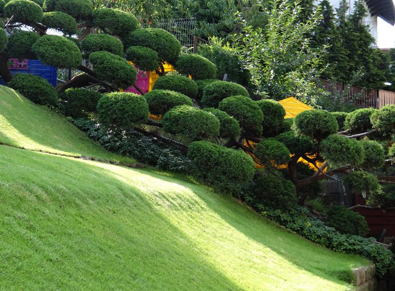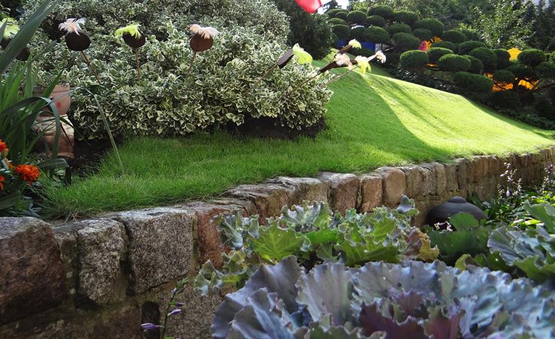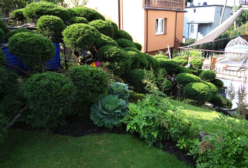 Całe ogrodowe założenie to autorstwo i wykonawstwo własne gospodarzy. W tym duma pana Wojciecha, czyli wspomniana skarpa, którą zamienił – jak to sam określa na własny użytek – w „minitarasy Wałów Chrobrego z megabonsai”. I pokazuje na krzewy gęsto rozrastających się wzdłuż płotu tuj. Zastosował im ostre cięcie i dzięki regularnemu strzyżeniu stworzył z nich oryginalne kompozycje przypominające japońskie bonsai, tyle że w znacznie większej skali.