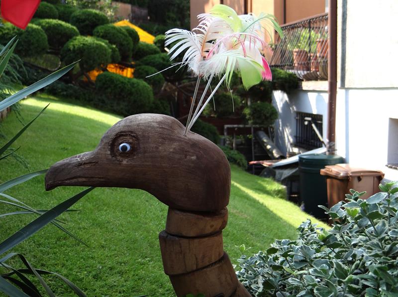 Na samo wzniesienie prowadzą schody wijące się pośród obrośniętych krzewami obrzeży w skarpie. Po drodze kolejne zaskoczenie. Oto nagle ukazuje się na niej paw, w jakiego pan Wojciech przemienił posadzone swego czasu trzmieliny.