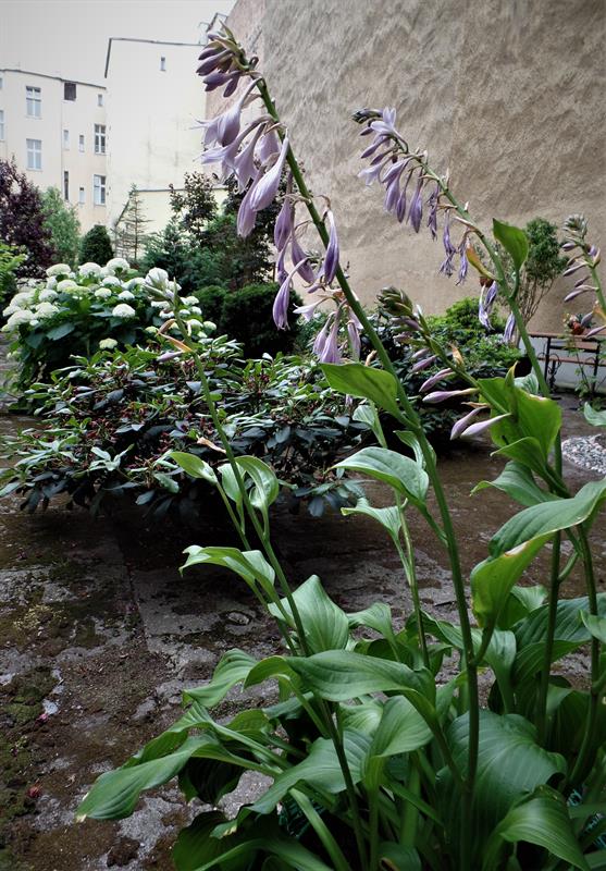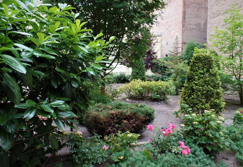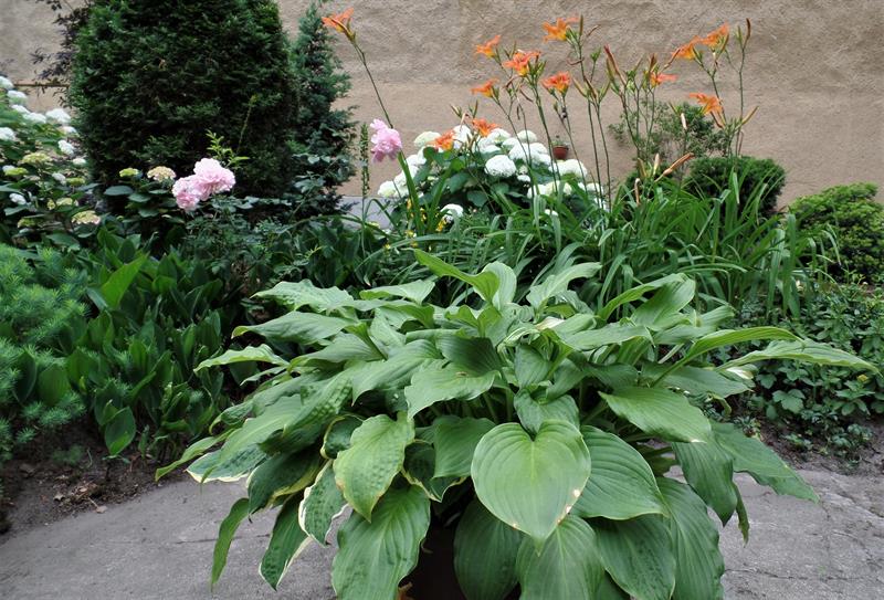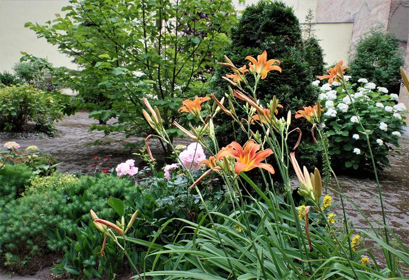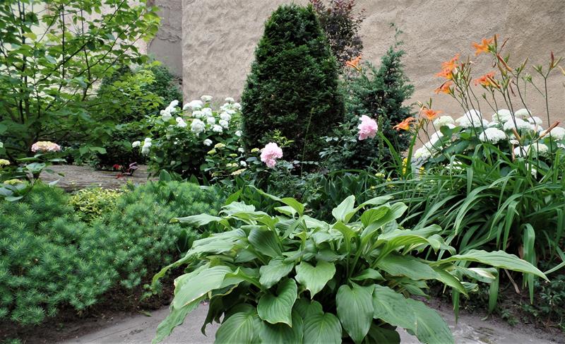 Jeszcze w ubiegłym sezonie najmocniejszym akcentem ogrodu były hortensje - bogactwem blisko 300 różnorodnych krzewów i odmian. Niestety, zmienna aura i przymrozki dały znać o sobie. Ostatnia zima zabrała ich blisko połowę. Ubyło też róż, choć wciąż wiele ich zachwyca przełamując intensywnymi barwami płatków monotonne tło zaniedbanych murów. Zachwycają wybujałe hosty, różaneczniki i ostrokrzewy. Przeplatane gipsówką i begoniami. Niesprzyjającej aurze upalnej wiosny skutecznie się oparły liliowce. Na kwitnienie, choć w pojemnikach, już czekają canny. Ogród zawędrował ostatnio nawet na trzepak: amplami z wielobarwnych bratków, pelargonii, aksamitek i niecierpków.