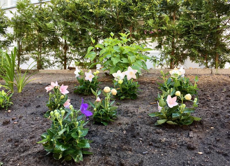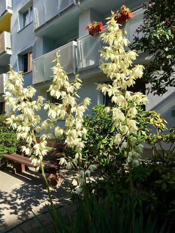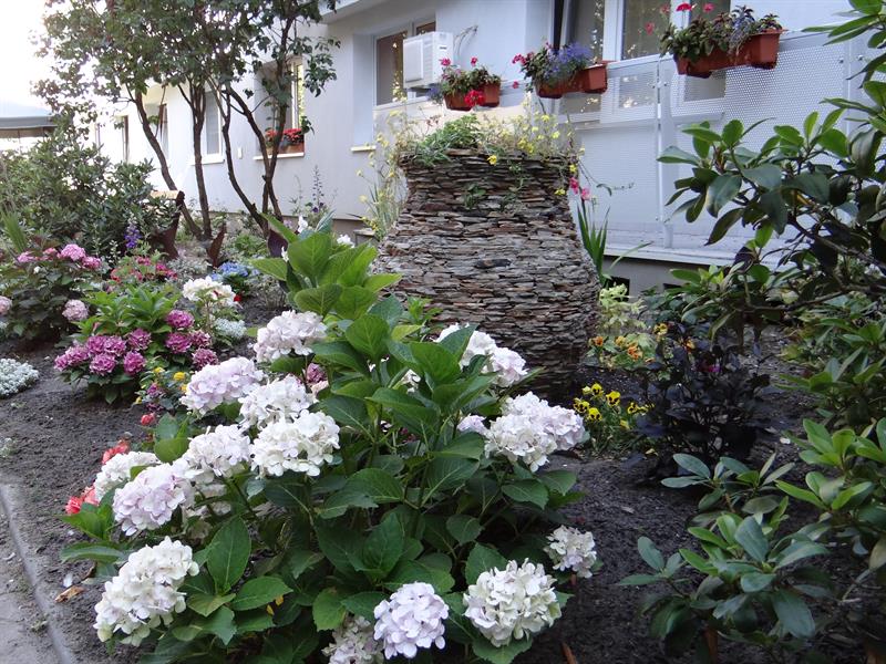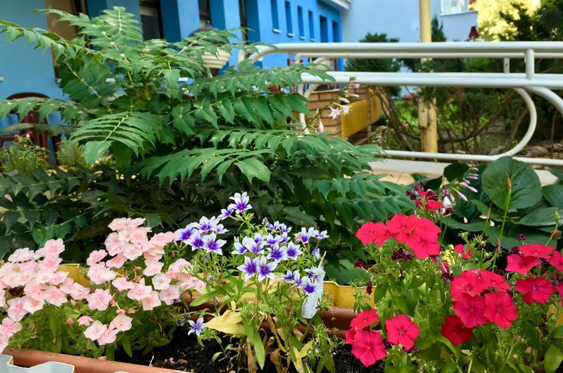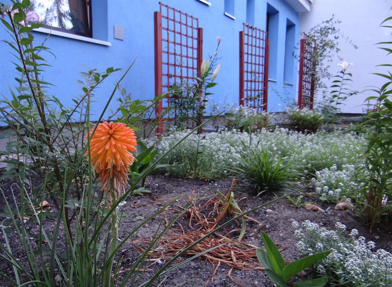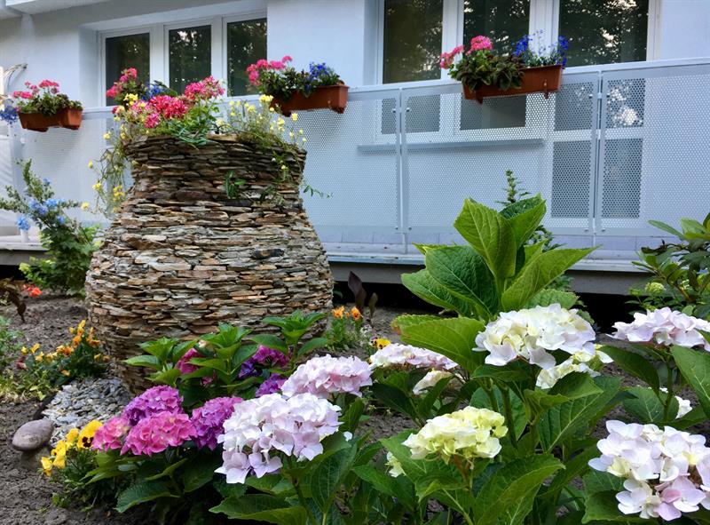 Co roku - w miarę możliwości - przydomowa kolekcja wzbogacana jest okazami roślin. W tym zakwitły posadzone minionej jesieni hortensje. Od wiosny oczy mieszkańców i pracowników placówki cieszyły nowe magnolie, a także narcyzy, żonkile, krokusy i tulipany. W zakątku przy wejściu na początku lipca swym pięknem urzekały lilie i obsypane biało-kremowymi kielichami kolby juk.