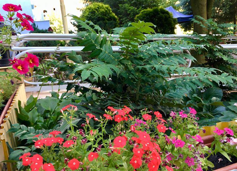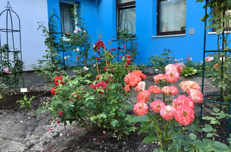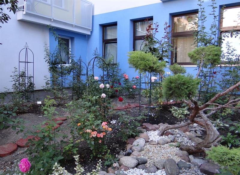 Przy oczku wodnym obok głównego wejścia do budynku pojawiły się krzewy mahonii ostrolistnej o lśniących liściach. Już po raz drugi w tym sezonie kwitną róże w urządzonej w narożniku przy wejściu mini-różance. Są róże rabatowe, angielskie, pnące, okrywowe w wielu kolorach. W sumie kilkadziesiąt krzewów. A dodatkowym przy nich akcentem jest przekształcony w drzewko bonsai jeden z iglaków. To dzieło rąk Joanny Robuty, która poza pracą lubi spędzać czas na relaks na swej działce, a w placówce łączy na co dzień ogrodową pasję z prowadzeniem kawiarenki ze świetlicą.