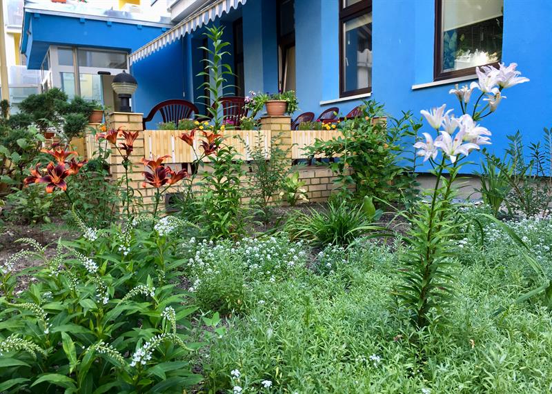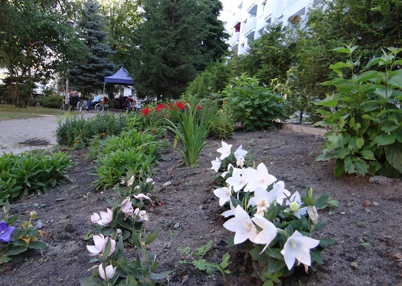 Z pasją od lat wspólnie urządzają swe najbliższe otoczenie. Pokazują, że podwórze przed dwoma czteropiętrowymi blokami to także ich dom. I równie ważne miejsce: pod chmurką wśród drzew, krzewów i kwiatów. Tu spędzają czas, spacerując, spotykając się na rozmowach z sąsiadami i uczestnicząc w organizowanych dla nich zajęciach.