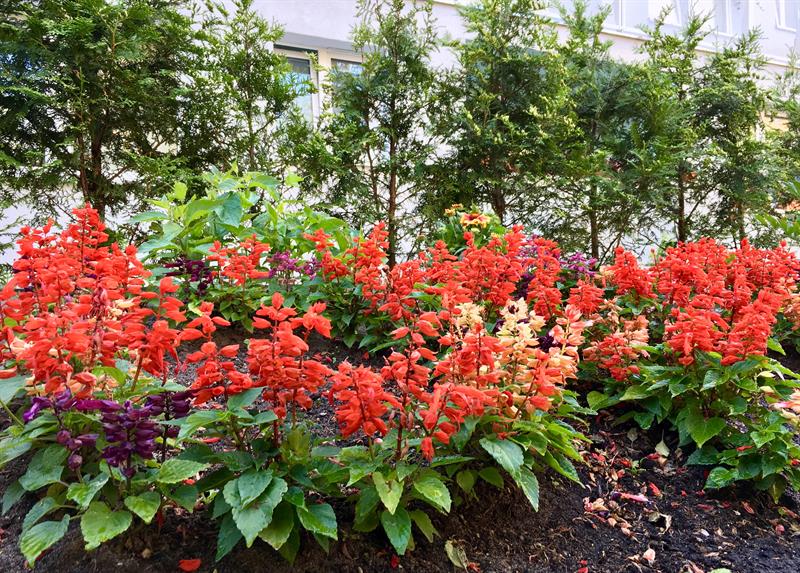 Wzdłuż niewielkiej skarpy przy alejce spacerowej na tle zieleni tuj zakładane są systematycznie i w miarę posiadanych środków nowe rabaty. Skomponowane zostały m.in. z rozwarów i szałwii.