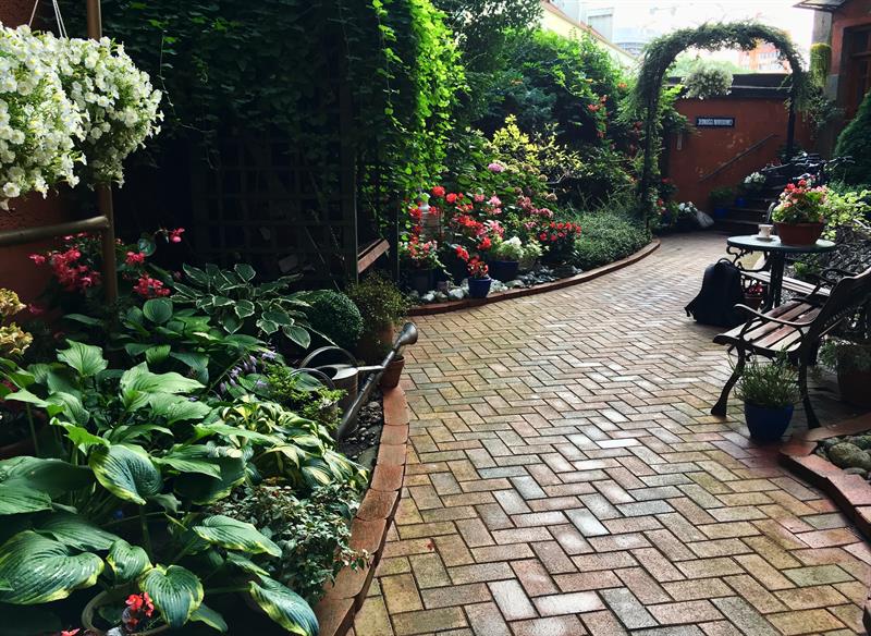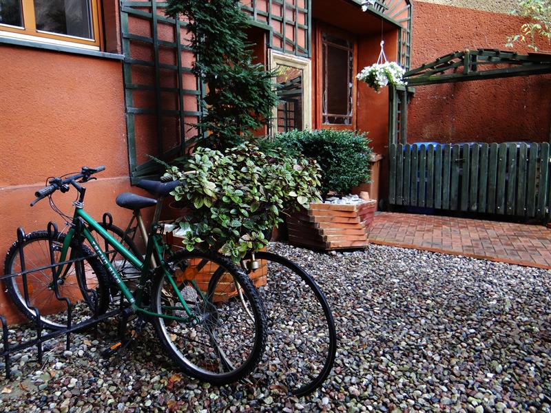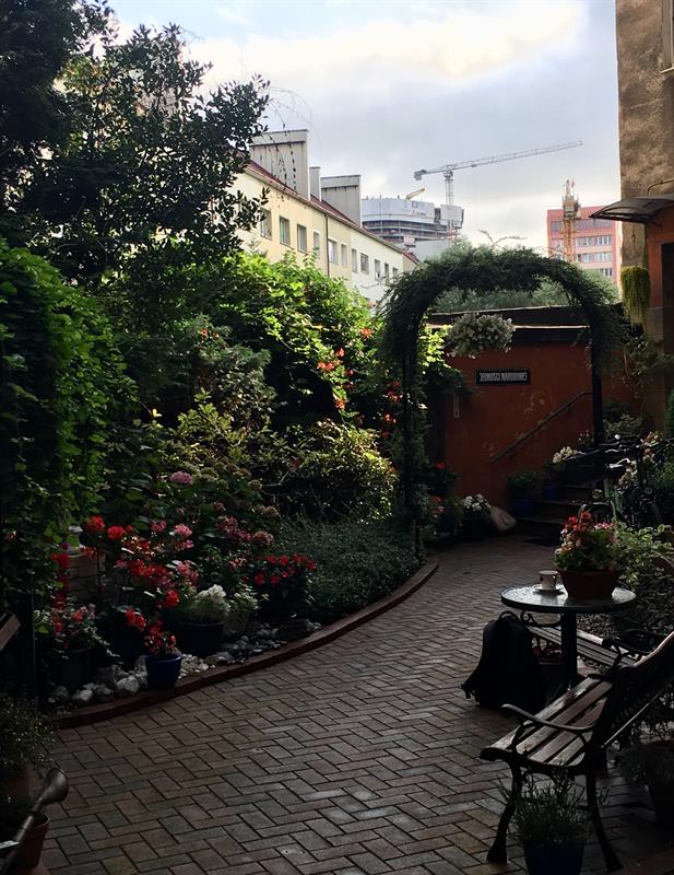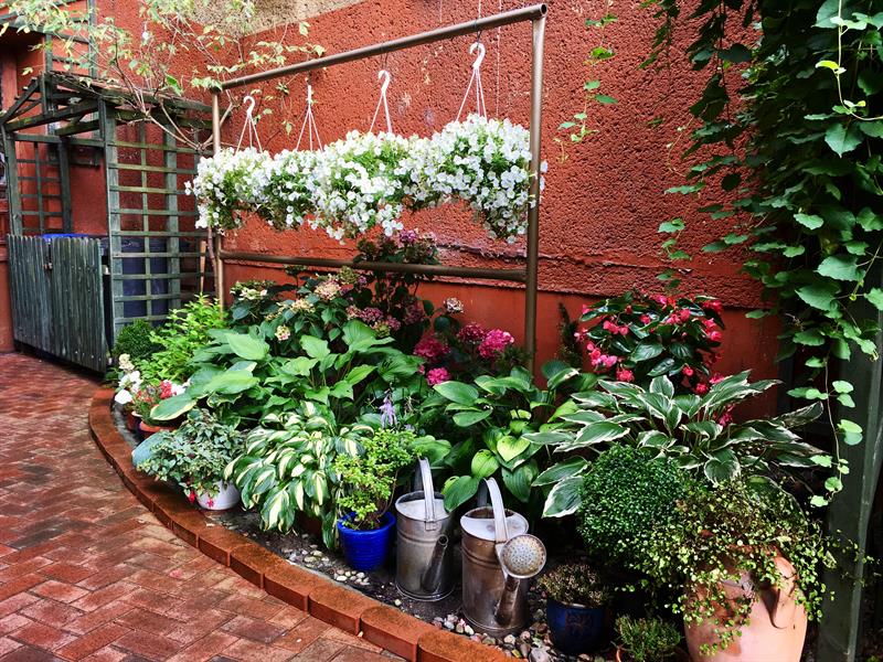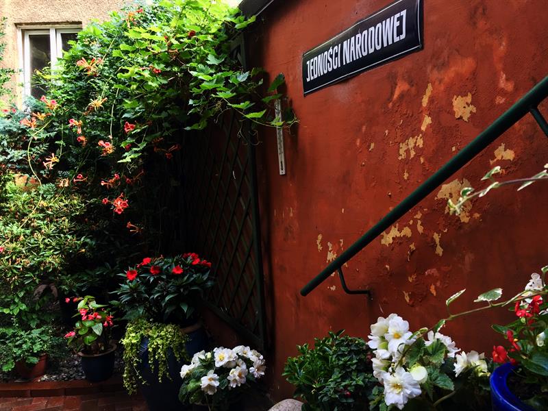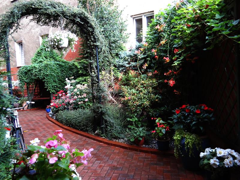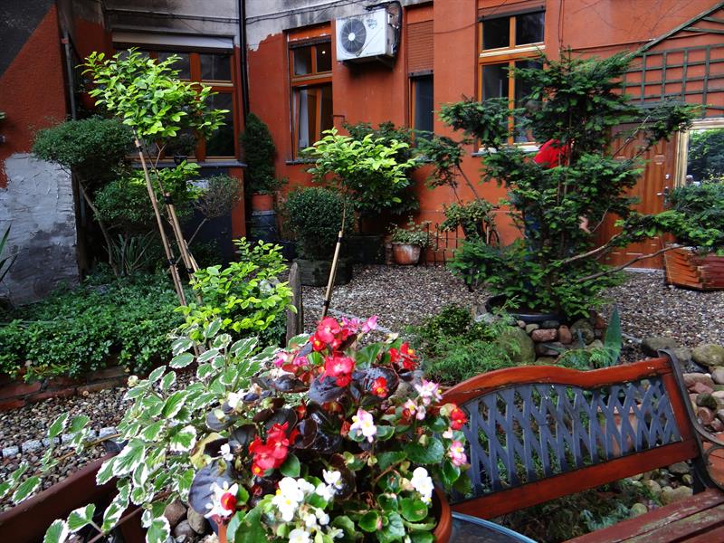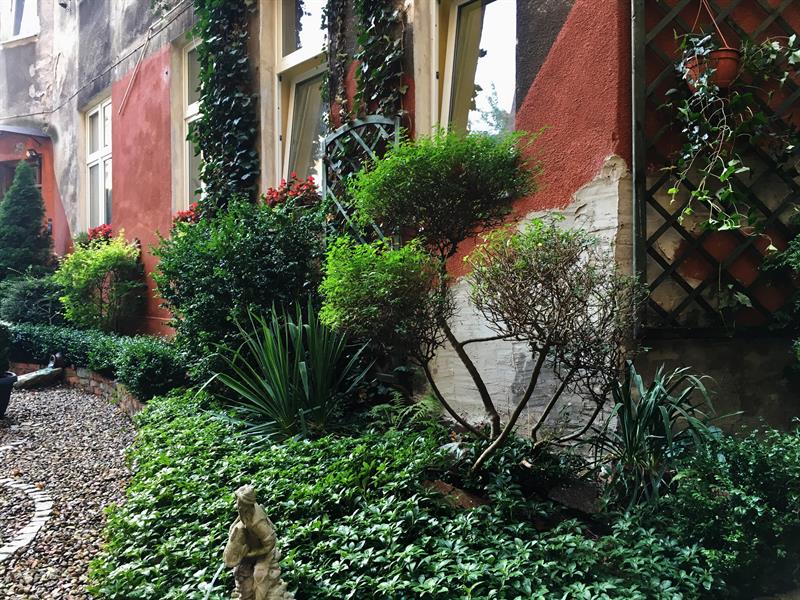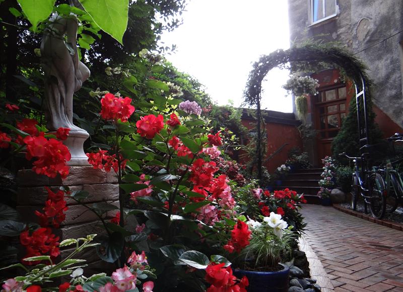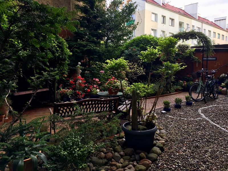 Wkoło bujna zieleń w każdym zakątku przeplatana roślinami sezonowymi, jednorocznymi. Rower sprzed dziesiątek lat, kupiony w punkcie skupu złomu za 15 zł – teraz w roli klombu z okazami jednej z odmian komarzyc. Trzepak służący do zawieszania donic tym razem wypełnionych surfiniami obsypanymi białymi kwiatami rozjaśnia elewację jednej ze ścian kamienicy.