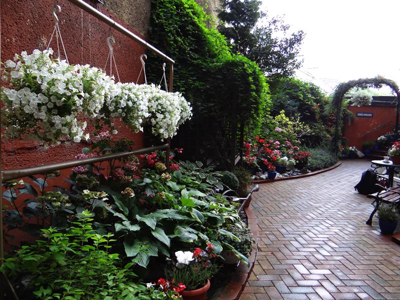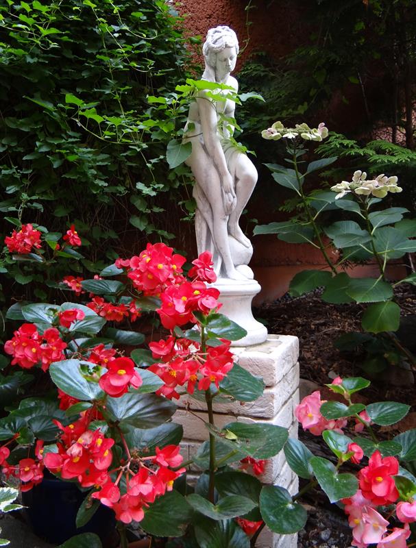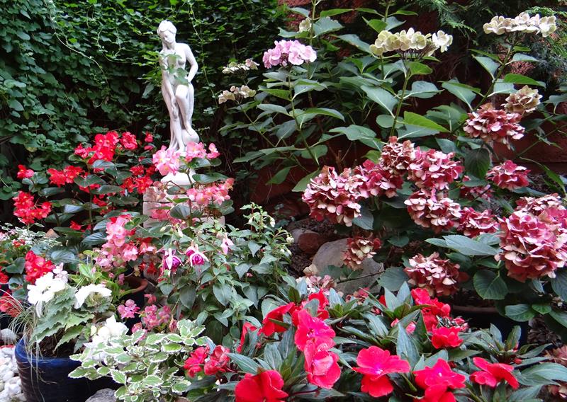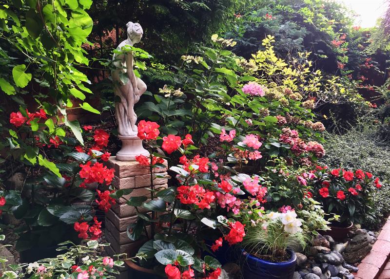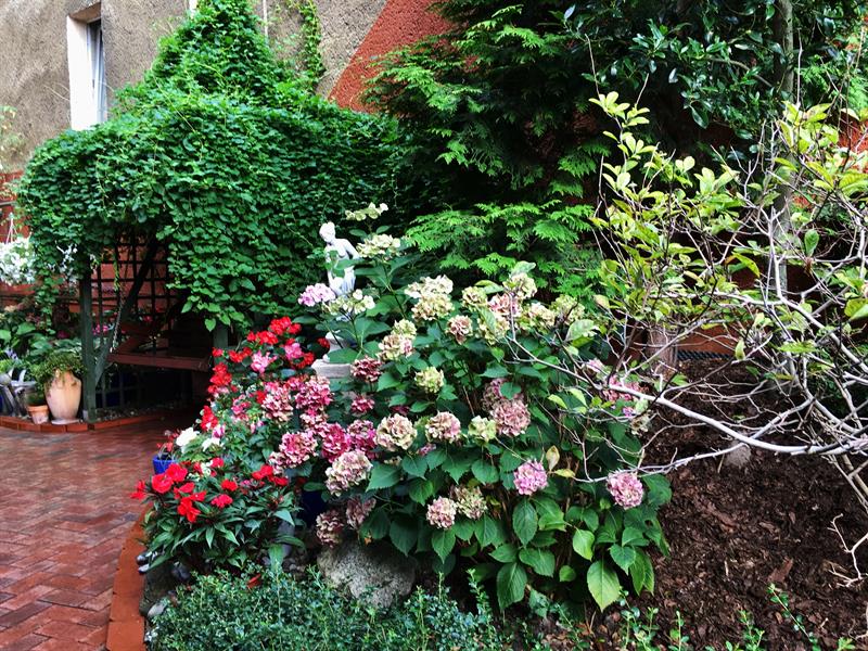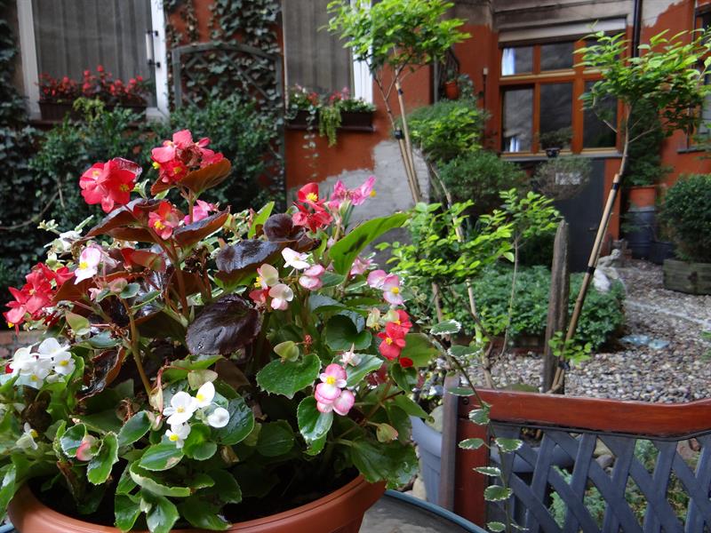 Nieco dalej na schodach prowadzących do oficyny też donice z begoniami przetykane komarzycami. W innej części podwórka-ogrodu funkie, fuksje, hortensje, okazała laurowiśnia, a zakątek z pojemnikami na śmieci przesłonięty okazem klonu palmowego.