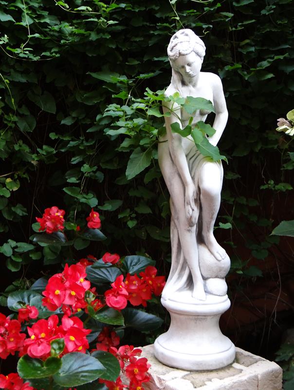 To miejsce wciąż się przeobraża. Stopniowo, rok po roku. Od ponad dekady. Gdziekolwiek spojrzeć, coś przykuwa wzrok. Raz jest nim stara ocynkowana konewka za ławeczkami i stolikiem. To znów mała fontanna z kamienia w kształcie figurki chłopca z rybką na styku murku z przedwojennej cegły i odcinającego się wyraźnie od niego pasa przestrzeni wysypanej kamykami. Intrygują też skryte wśród krzewów pokryte już nieco patyną postaci parka przytulających się i w geście pocałunku postaci. Herubinki wtulone w siebie i trzmieliny. A nieopodal stojak na rowery, oczywiście użyteczny, a wykonany z nikomu już niepotrzebnego fragmentu okiennej ozdobnej kratownicy. To znów rzeźba Wenus oblewana ostatnimi promieniami przedpołudniowego słońca przy niewielkiej skarpie. A w tle, idąc dalej wzdłuż ścieżki, kwitnąca na pomarańczowo „ściana” milinu amerykańskiego. Obrazy zmieniają się jak w kalejdoskopie, w zależności od miejsca, z którego patrzymy.