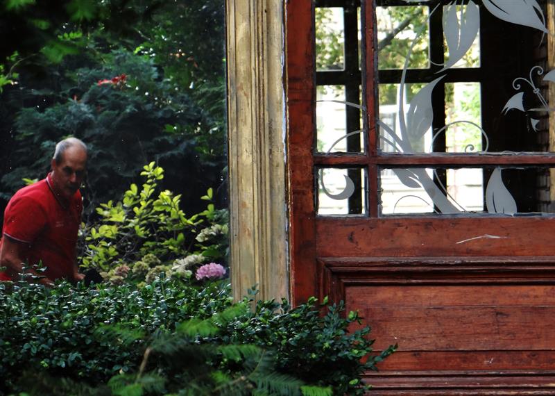 Dziedziniec między frontem a oficyną ograniczony jest murami garaży oraz sąsiedniej kamienicy. Tutaj słoneczne promienie docierają ledwie przez kilka godzin i nie więcej niż na trzy metry szerokim pasem do południa błądzą ledwie i nieśmiało po roślinach. Stąd też ich dobór, czyli w większości krzewy zimozielone i iglaki.