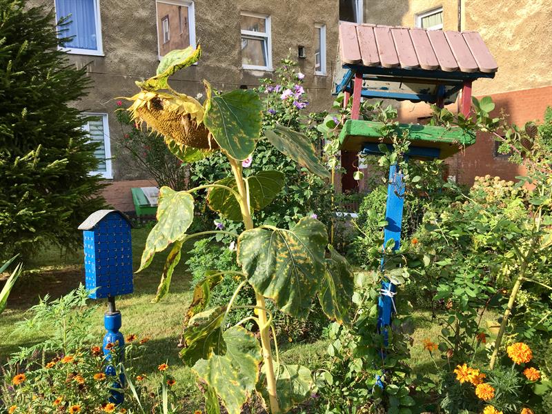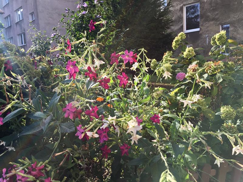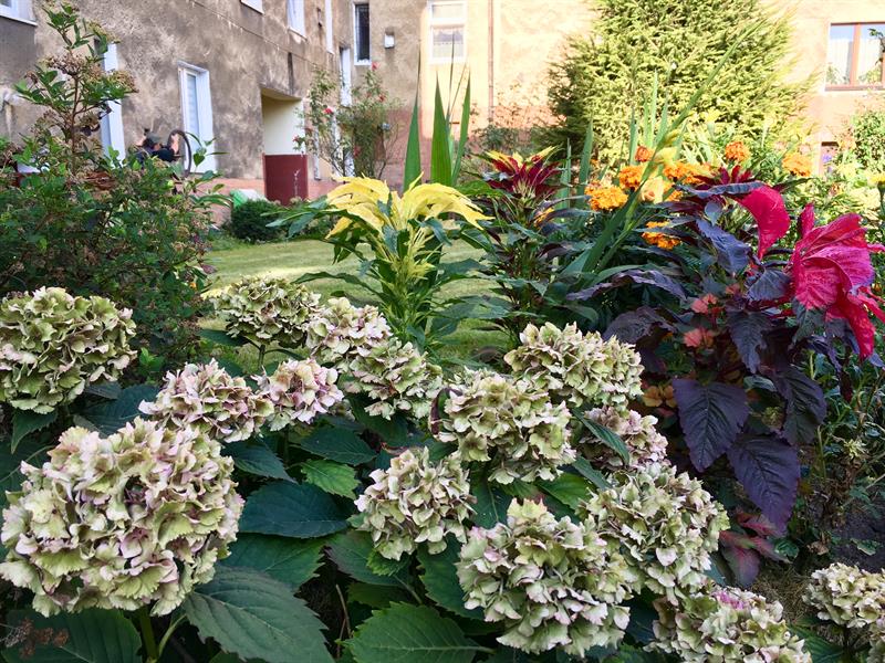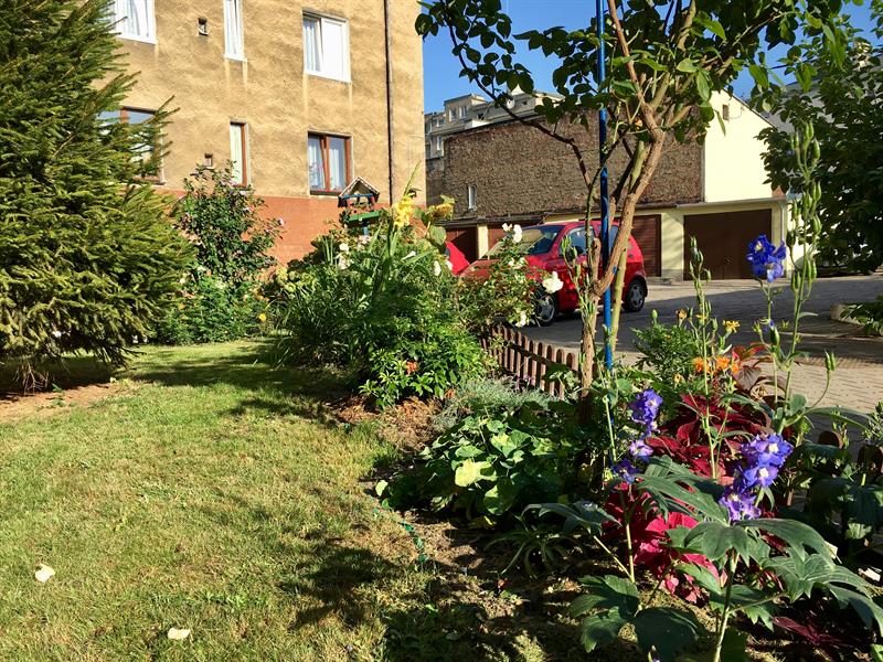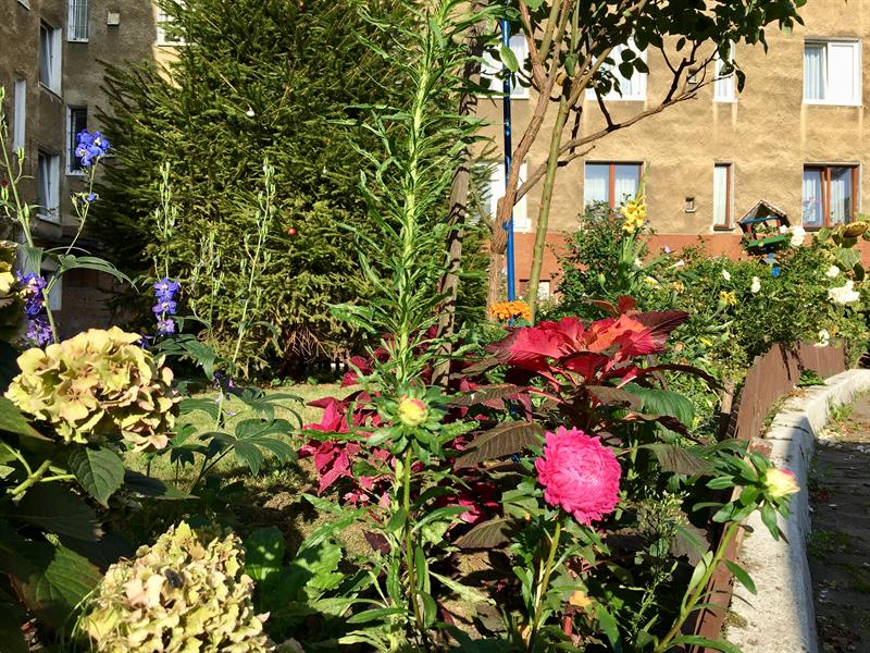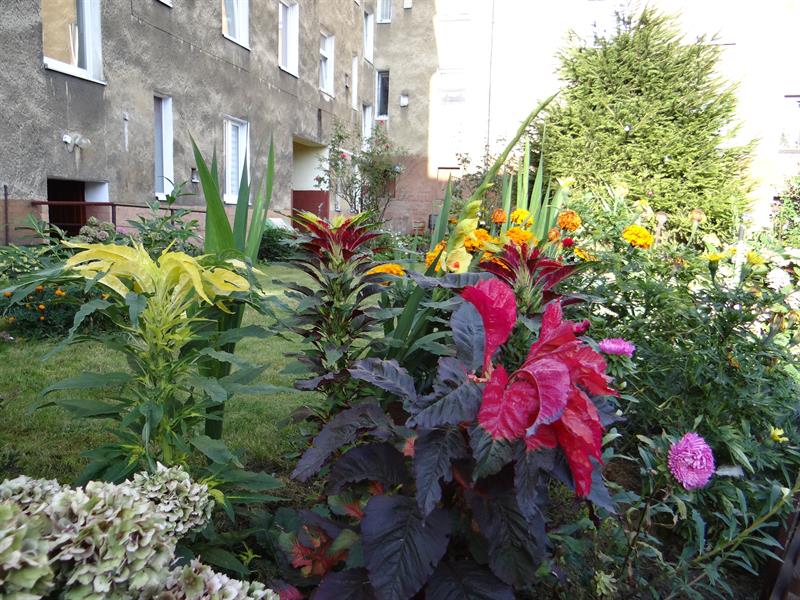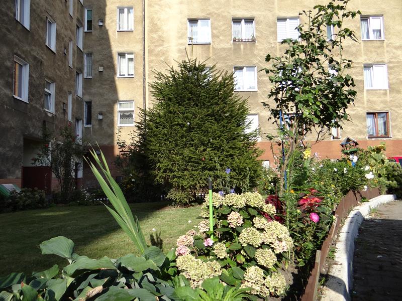 Od podwórza na skrawkach ziemi nie brak hortensji, liliowców, funkii. Tam też znalazło się miejsce na miejski hotelik dla pszczół. Z kwitnących tu wielu roślin mogą czerpać nektar. Jest też dla nich schronienie na zimę. W korony drzew zlatują się i śpiewają ptaki. Pan Franciszek zadbał o budkę lęgową dla kosa, w drugiej stałymi już bywalcami są sikory. Znalazł się tam też kącik z ziołami, których każdy z mieszkańców, przed wejściem do klatki schodwej, może sobie urwać i dorzucić do przyrządzanych w domu potraw.