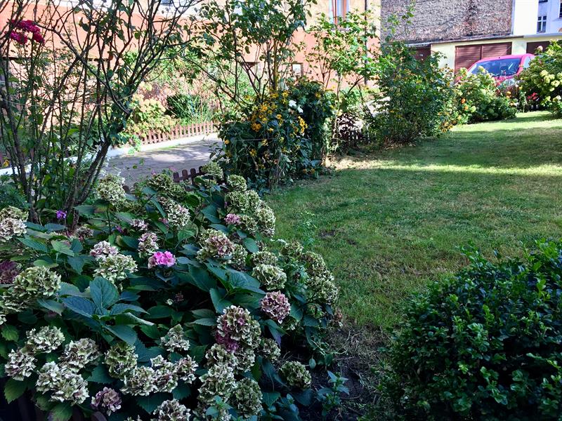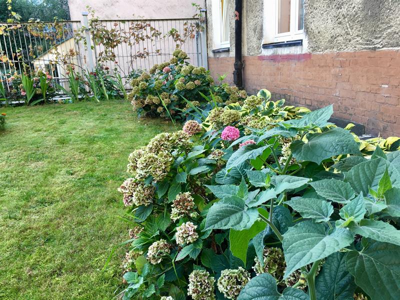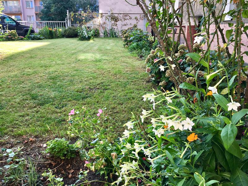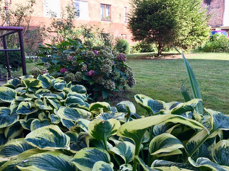 W zależności od sezonu w pejzażu podwórkowym pojawiają się rumianki, rudbekie, złocienie, astry. Kwitną szałwie obok krzewuszek, aksamitek, ślazów i mieczyków. W tym roku pojawił się pieris japoński. Jest też miejsce dla kwiatu tytoniu, kobei i ostróżki. Wraz z nadejściem wiosny na rabacie zakwitają tulipany, żonkile, cesarskie korony, a przestrzeń obsianą trawą opanowują krokusy. Pośrodku niej pyszni się okazały kilkunastoletni już świerk, która na czas Bożego Narodzenia zamienia się w świąteczne drzewko z bombkami oświetlane lampkami. ©℗