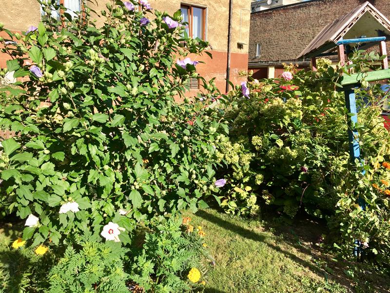 - Zaczęło się od róż, potem doszły kolejne rośliny, w tym flance z upraw działkowych, w tym krzewy hibuskusa. Ten, który rośnie w podwórzu jest niezwykły, bo dwubarwny, jego kwiaty zakwitają na fioletowo i na biało. To taki dość nieoczekiwany efekt moich szkółkarskich eksperymentów - żartuje pan Franciszek.