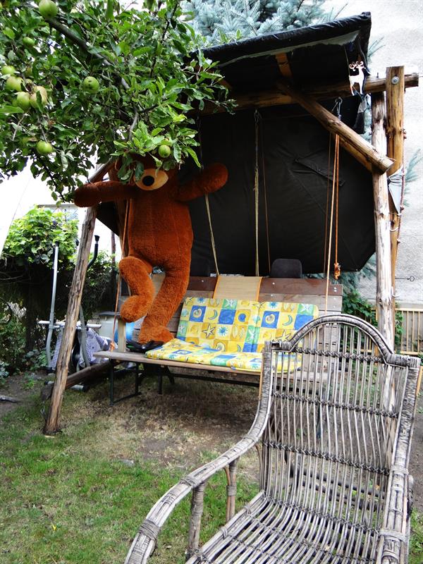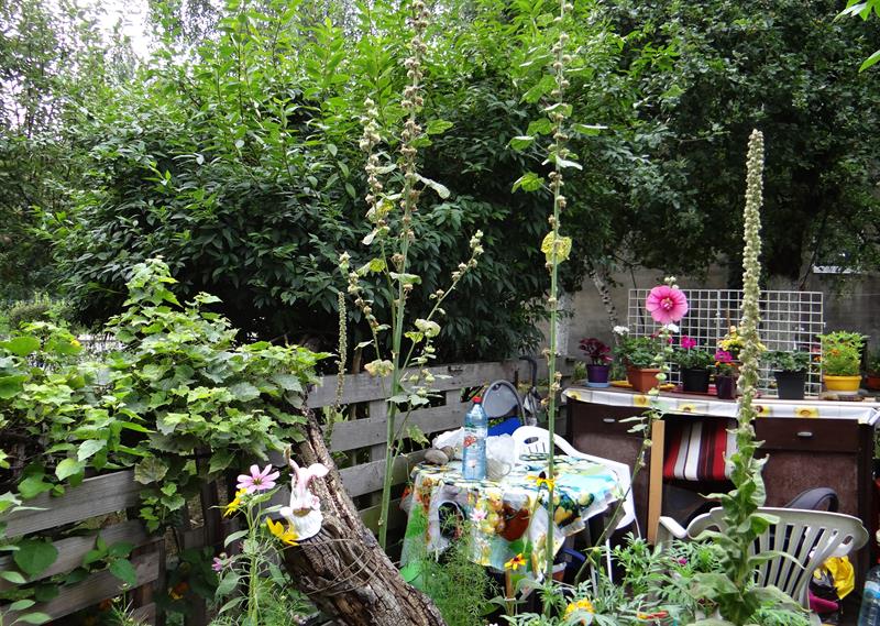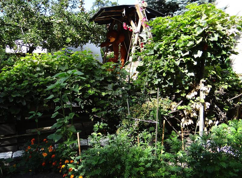 Na kilkuset metrach kwadratowych między szarymi murami kamienic rosną strzeliste, sięgające już dachów, brzozy i świerki. Są jabłonie, jarzębina, bez, a kącik wypoczynkowy otaczają rozłożysta forsycja i orzech włoski. Pod tym ostatnim w cieniu, dla relaksu między pieleniem i podlewaniem, stoi wiklinowy bujany fotel. Teraz pani Grażyna ma dodatkowo pod baldachimem kanapę. Do tego winorośl. A całość uzupełniają przycięte w kule bukszpany, kilka hortensji, tuje, kwiatowe rabaty z dziurawcami, złocieńcami, rudbekią, miechunką, żurawkami, bezwonną maruną nadmorską, aksamitkami. Te ostatnie także w doniczkowych kompozycjach ustawione na ogrodowych meblach obok pelargonii i begonii. ©℗