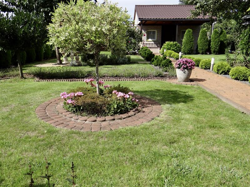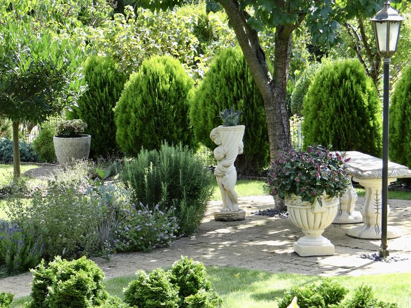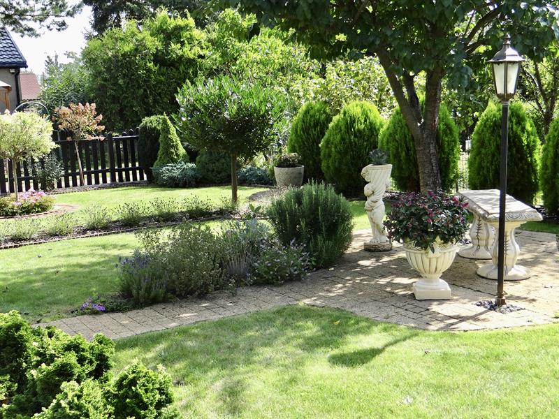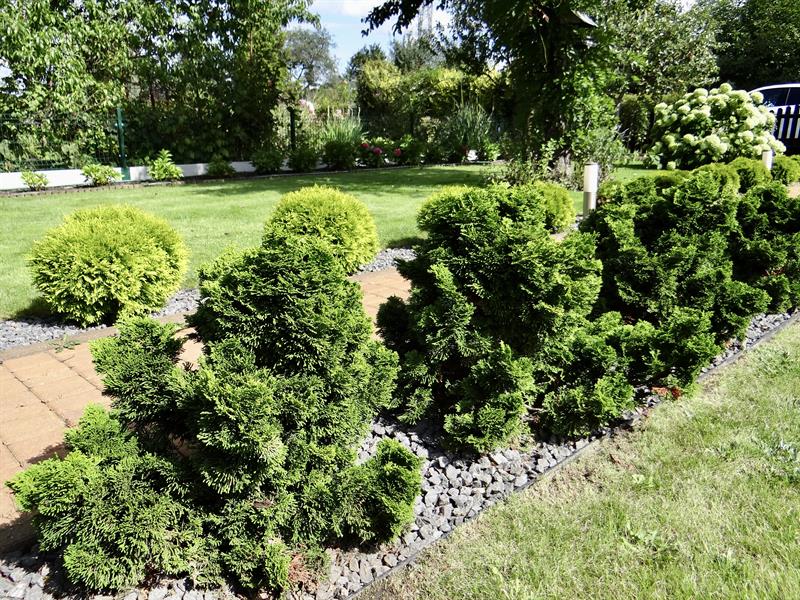 Pośrodku, od furtki aż do zadaszonej werandy przed domkiem alejka z płytek w kolorze rdzy i z odcinającymi się po obu jej stronach szarymi obwódkami. Wzdłuż niej jedna z rabat wysadzana krzewami kolistych tuj, której dodatkowym akcentem są rozstawione w regularnych odstępach niewielkie ogrodowe latarenki, a druga dla odmiany kilkunastoma cyprysami japońskimi, które swymi naturalnymi kształtami przypominają drzewka bonsai. Ich soczystą zieleń uwydatnia wysypane szarym grysem podłoże.