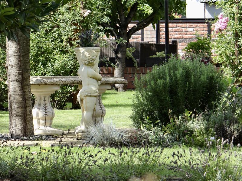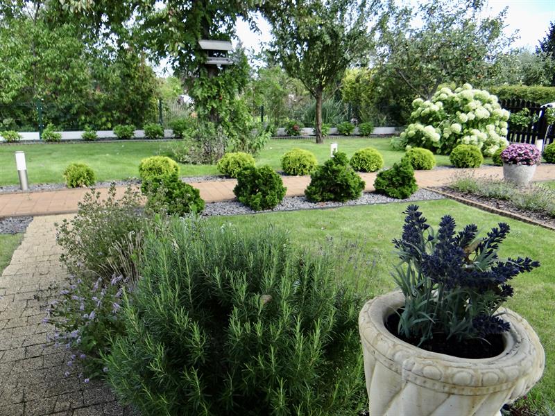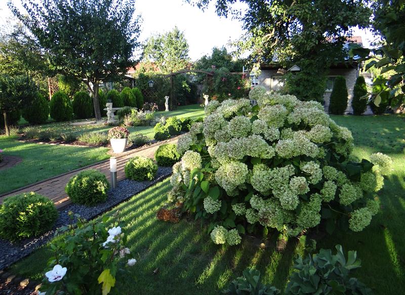 Od frontu witają przechodzących ogólnodostępną ogrodową alejką Pogodną niskie trzmieliny przy podmurówce wysypane pasem kory, a tuż za płotem z jednej strony trzy krzewy pienne hortensji bukietowej i dwa krzewy miniaturowego bzu, z drugiej zaś hibiskusy, miłorząb i trzmielina. Po prawej, patrząc od działkowej bramki, ciągnąca się wzdłuż płotu czytelnie zaznaczona rabata wysadzana wyłącznie hortensjami ogrodowymi, od lewej zaś rosnące w szpalerze tuje. W trawnikowych dywanach w kolistych rabatach pienna wierzba ozdobna i buchająca jeszcze bielą kwiatostanów gigantyczna hortensja. Dalej wyraźnie zaznaczona, odcinająca się między pasami trawy rabata z laurowiśnią, lawendą, a za nią kolejna z ziołami: mięta, rozmaryn, szałwia, liść laurowy, oregano.