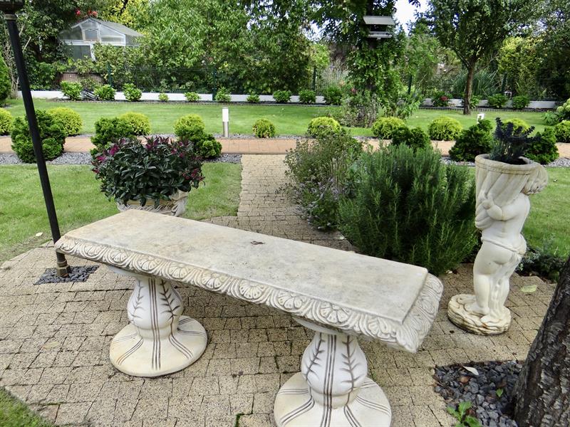 Nieopodal jedna z trzech wysp do relaksu w cieniu śliwy. Wyłożona w nieregularnym kształcie kamienną kostką, z kamienną ławą, do tego dwie donice wyglądem nawiązujące do klasycyzmu, z krzewami hebe i stylowa ogrodowa latarenka. Za tym zakątkiem wzrok przyciąga pergola z prześwitem i tworzące na niej ścianę kwitnące na różowo krzewy róż. Jeszcze dalej przesłonięty nimi w samym narożniku i opasany żywą cegłą podest, a na nim drugi z rodzinnych zakątków wypoczynku i błogiego lenistwa. Również podświetlany. Z okazami piołunu i sundevilli na wejściu przy ceglanym murku.