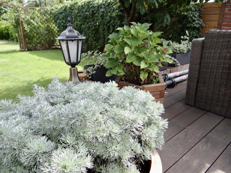 Działkową przestrzeń tuż przed altaną przesłaniają z kolei strzeliste tuje i rosnący punktowo krzew hortensji. Na skraju przy płocie jaśmin i strzyżone kule bukszpanów. Uzupełnieniem kompozycji są zakątek zimozielonych iglaków z okazem smukłej sośnicy, pnąca się w innym miejscu po pniu gruszy glicynia i wyeksponowane w dużych donicach – teraz na przełomie letnio-jesiennym – astry marcinki. ©℗