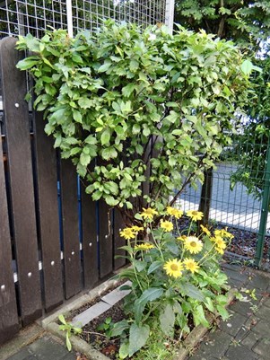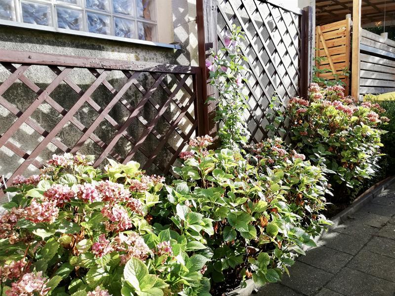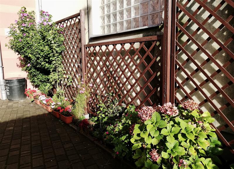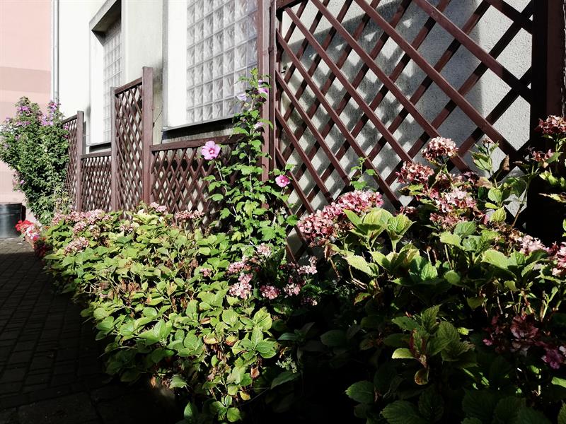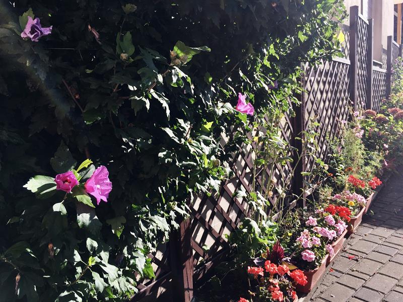 Najpierw były to głównie róże. Te jednak marniały z roku na rok, mimo usilnych starań nie udało się ich odratować i reszty dopełniły mszyce. Krzewy trzeba było wykarczować. Teraz wąskie rabaty wzdłuż muru i ogrodzenia przyległego parkingu porastają hibiskusy, wielokolorowe malwy, hortensje, piwonie.
