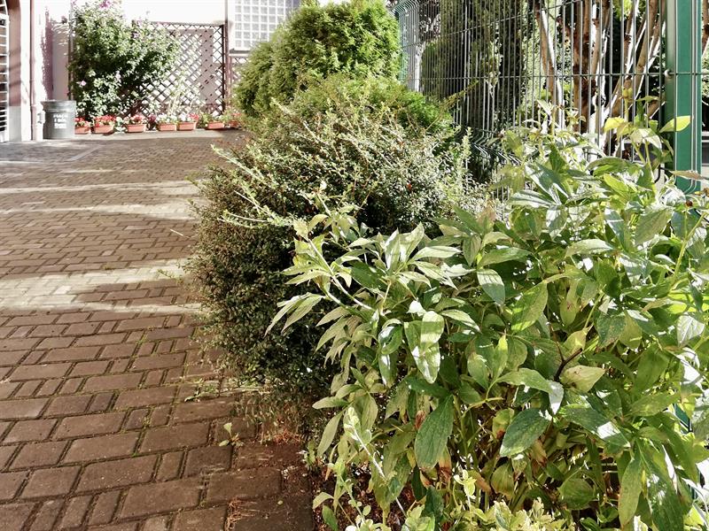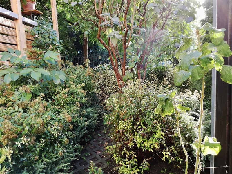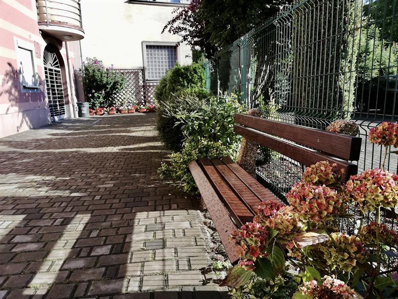 W niewielkiej wspólnotowej przestrzeni znalazło się też miejsce dla juki, bzu w kąciku przy parawanie śmietnikowym, gdzie kiedyś była piaskownica. A wszystko przetykane krzewami irg, tuj, pierisami, aksamitkami, nagietkami, ślazami i dzielżanami. W tym sezonie przy wąskiej rabacie pojawiły się też skrzynki z pelargoniami.