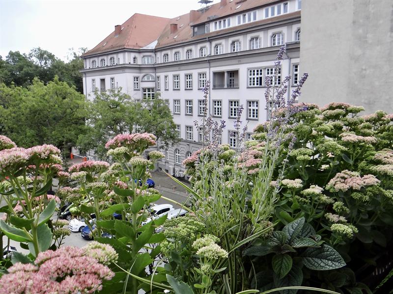 Z widokiem po lewej na obdarte z tynku mury przedwojennej oficyny i z prawej na zadbany teren odnowionej siedziby szczecińskiego oddziału spółki Enea Operator. Kontrastujące sąsiedztwo, w pejzażu szczecińskim - niestety - wciąż częściej norma aniżeli wyjątek. Za to jednak w zaciszu, z wystawą od wschodu.